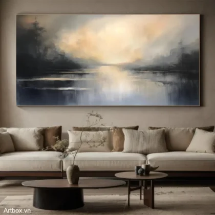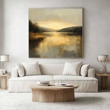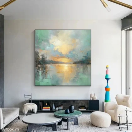 Ánh Hoàng Hôn Trên Hồ – Tranh Sơn Acrylic Trừu Tượng Hồ nước Vàng Trang Trí Phòng khách, Phòng ngủ – Phong Cách Hiện Đại