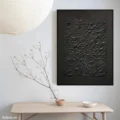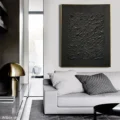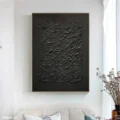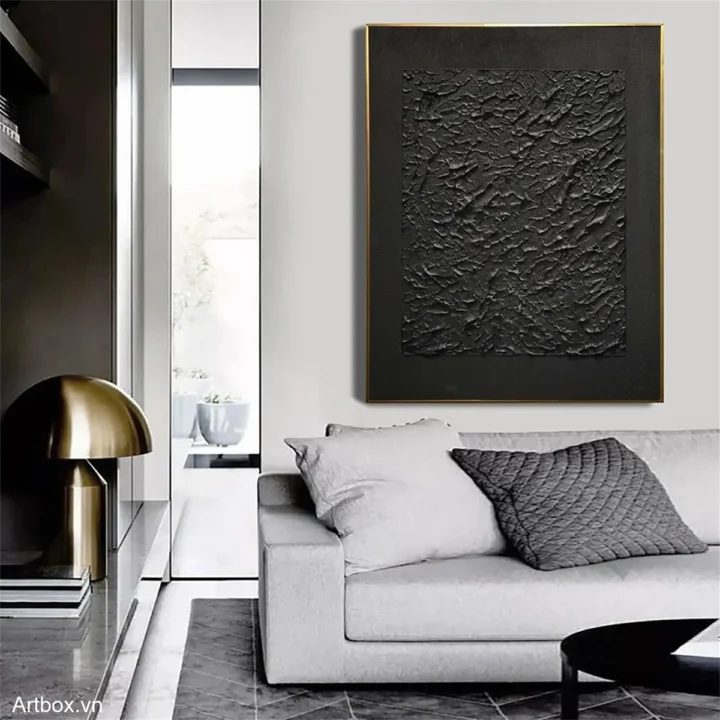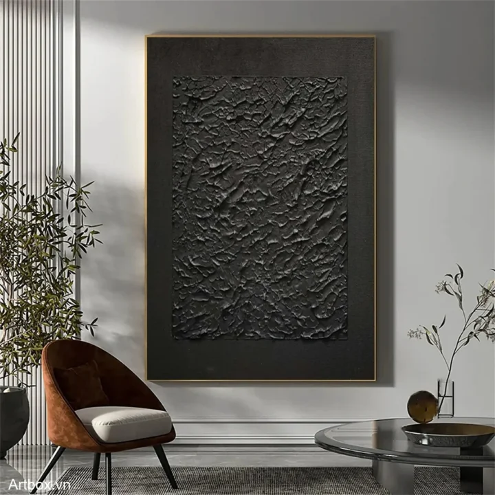 Bức tranh mang đến một không gian bí ẩn với bề mặt texture nổi, tạo cảm giác sâu lắng và mạnh mẽ. Màu đen chủ đạo không chỉ thể hiện sự tinh tế mà còn khơi gợi sự tò mò và khám phá. Những đường nét uốn lượn, gồ ghề của bề mặt khiến người xem cảm nhận được chiều sâu và sự sống động, như một cuộc hành trình vào những miền đất chưa được khám phá. Bức tranh phù hợp với không gian hiện đại, tạo điểm nhấn độc đáo cho phòng khách hoặc phòng làm việc, đồng thời mang lại cảm giác trầm lắng, suy tư.