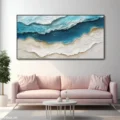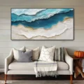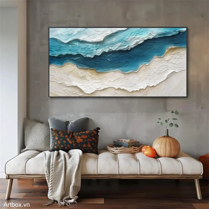 Bức tranh khắc họa một cảnh biển tuyệt đẹp, nơi những làn sóng xanh dương hòa quyện với màu trắng của cát. Kỹ thuật texture nổi tạo ra chiều sâu và sự sống động, khiến người xem cảm nhận được sự chuyển động của nước. Các sắc thái xanh từ nhạt đến đậm mang lại cảm giác dịu nhẹ, tươi mới, như làn gió biển mát lành. Bức tranh không chỉ là một tác phẩm nghệ thuật, mà còn là nguồn cảm hứng cho những khoảnh khắc thư giãn, tạo nên không gian ấm cúng và dễ chịu cho căn phòng.