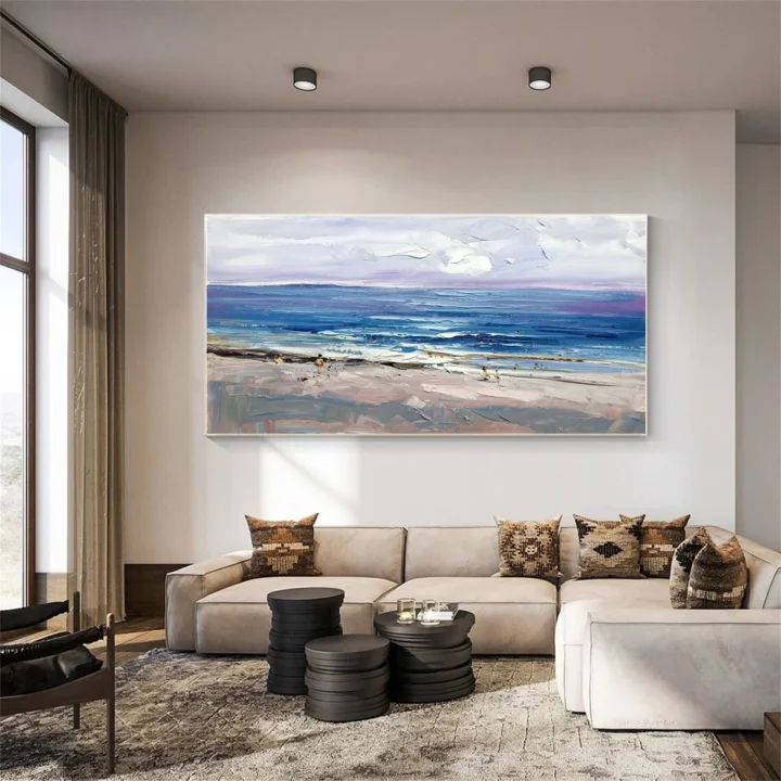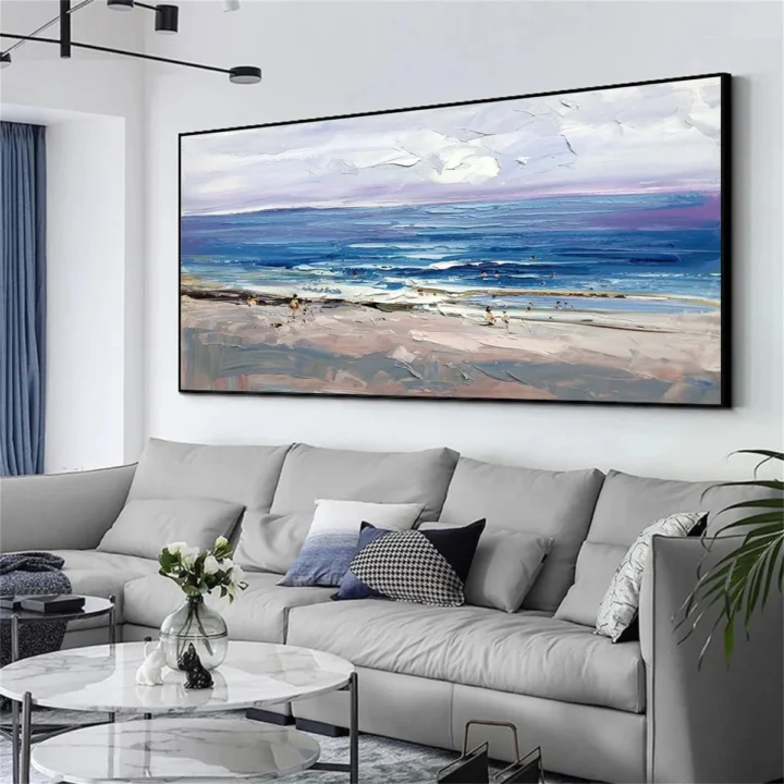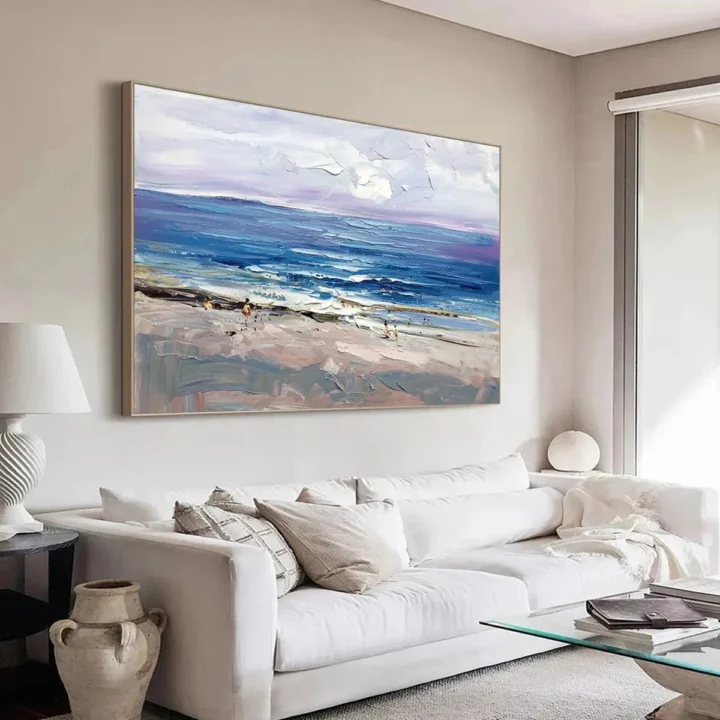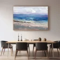 Bức tranh mang đến một khung cảnh biển tuyệt đẹp, nơi ánh sáng bình minh chiếu rọi trên mặt nước xanh dương, tạo nên một không gian yên bình và thư giãn. Những làn sóng nhẹ nhàng vỗ về bờ cát, hòa quyện cùng những đám mây trắng bồng bềnh trên bầu trời. Kỹ thuật vẽ texture nổi làm nổi bật sự sống động của cảnh vật, mang lại cảm giác như bạn có thể chạm vào từng lớp sóng. Màu sắc tươi sáng và nhẹ nhàng giúp bức tranh trở thành điểm nhấn hoàn hảo cho không gian sống, tạo cảm hứng cho những khoảnh khắc thư giãn và sáng tạo.