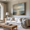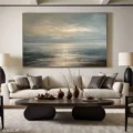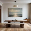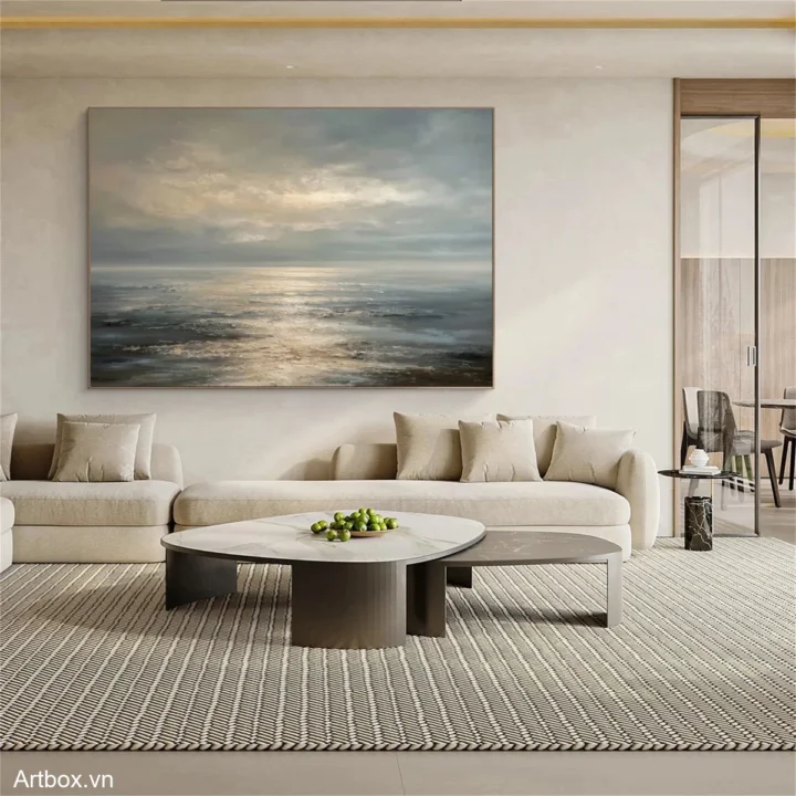 Bức tranh mang đến một khung cảnh biển cả yên bình, nơi mặt nước phản chiếu ánh sáng của bình minh. Những lớp sóng nhẹ nhàng vỗ về bờ cát, tạo nên một cảm giác thư thái và thanh tịnh. Màu xanh dương chủ đạo hòa quyện với những sắc thái của bầu trời, tạo nên một không gian rộng lớn, mở ra những suy tư về tự nhiên và cuộc sống. Kỹ thuật vẽ phẳng giúp làm nổi bật sự nhẹ nhàng và hiện đại, mang lại cảm giác bình yên cho người xem. Đây là một tác phẩm lý tưởng cho không gian sống, kích thích sự sáng tạo và tạo cảm hứng.