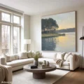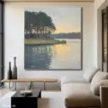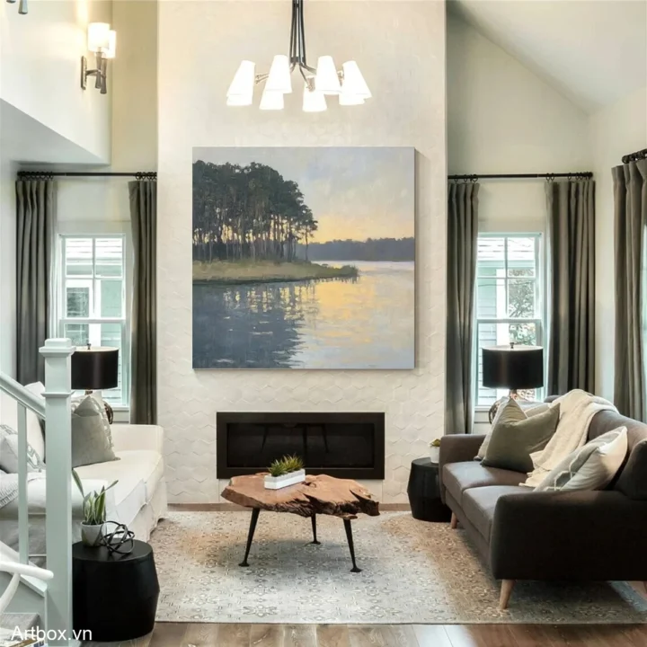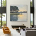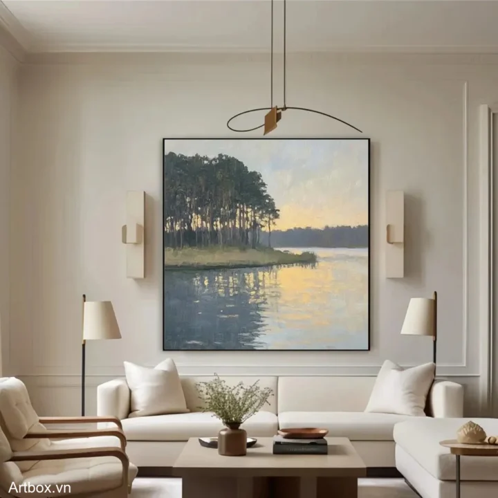 Bức tranh khắc họa khung cảnh yên bình của một hồ nước tĩnh lặng, nơi ánh sáng bình minh nhẹ nhàng phản chiếu trên mặt nước. Những tán cây xanh rì đứng sừng sững bên bờ, tạo nên một bức tranh hài hòa giữa thiên nhiên và ánh sáng. Kỹ thuật texture nổi làm cho bức tranh trở nên sống động, mang lại cảm giác gần gũi và ấm áp. Màu xanh dương chủ đạo kết hợp với sắc vàng nhẹ của ánh sáng buổi sáng tạo ra một không gian thư giãn, lý tưởng cho những ai tìm kiếm sự bình yên trong cuộc sống. Đây là tác phẩm hoàn hảo cho không gian sống hiện đại, mang lại cảm giác thanh thoát và dịu nhẹ.