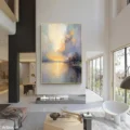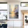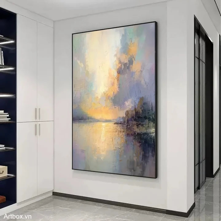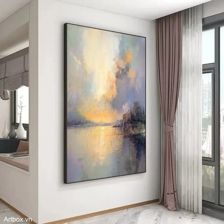 Bức tranh mang đến một cảm giác bình yên với khung cảnh thiên nhiên tuyệt đẹp. Mặt hồ lặng lẽ phản chiếu ánh sáng rực rỡ của bình minh, tạo nên một bức tranh hòa quyện giữa màu sắc ấm áp và tươi sáng. Những tông màu pastel nhẹ nhàng kết hợp với các sắc thái của vàng, cam và xanh, tạo nên một không gian thư giãn và thanh thoát. Kỹ thuật texture nổi được sử dụng để tạo chiều sâu, mang lại cảm giác sống động cho bức tranh, như thể người xem có thể cảm nhận được sự chuyển động của nước và không khí trong khung cảnh. Đây là một tác phẩm hoàn hảo cho những không gian cần sự tĩnh lặng và ấm cúng.