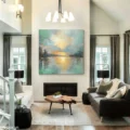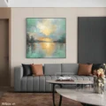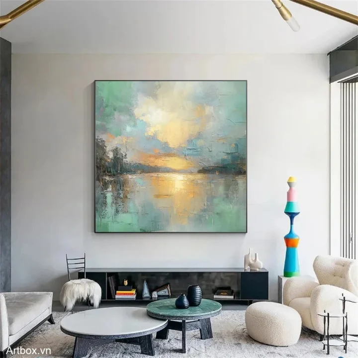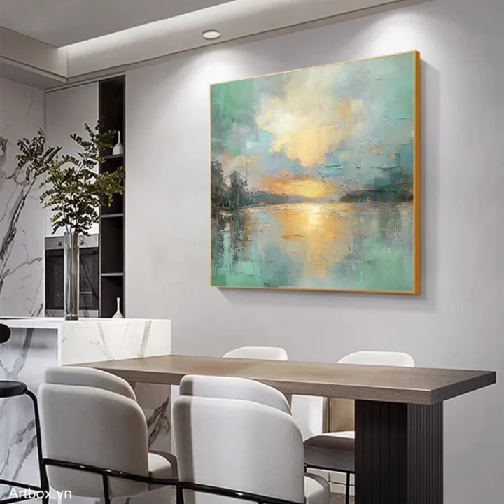 Bức tranh mang đến cảm giác yên bình và thư thái, với hình ảnh mặt nước tĩnh lặng phản chiếu ánh sáng của bình minh. Những gam màu xanh ngọc và vàng nhạt hòa quyện, tạo nên một không gian nhẹ nhàng, thanh thoát. Các chi tiết được thể hiện qua kỹ thuật texture nổi, mang lại chiều sâu và sự sống động cho bức tranh. Cảm giác như ta đang đứng bên hồ, ngắm nhìn cảnh sắc tuyệt đẹp, hòa mình vào thiên nhiên tươi đẹp. Đây là tác phẩm hoàn hảo cho những không gian cần sự thư giãn và tĩnh lặng.