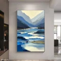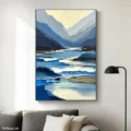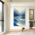Bức tranh mang đến một khung cảnh thiên nhiên hùng vĩ với những dãy núi xanh dương trải dài, hòa quyện cùng dòng sông phản chiếu ánh sáng. Màu sắc chủ đạo là các tông xanh dương đậm nhạt, tạo cảm giác yên bình và thư thái. Kỹ thuật texture nổi làm nổi bật chiều sâu và sự sống động của từng lớp màu, khiến người xem cảm nhận được sự chuyển động của nước và không khí trong không gian rộng lớn. Đây là tác phẩm lý tưởng cho những ai yêu thích vẻ đẹp tự nhiên, mang lại sự tĩnh lặng và cảm hứng cho không gian sống.
