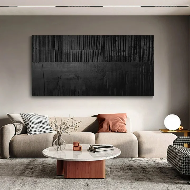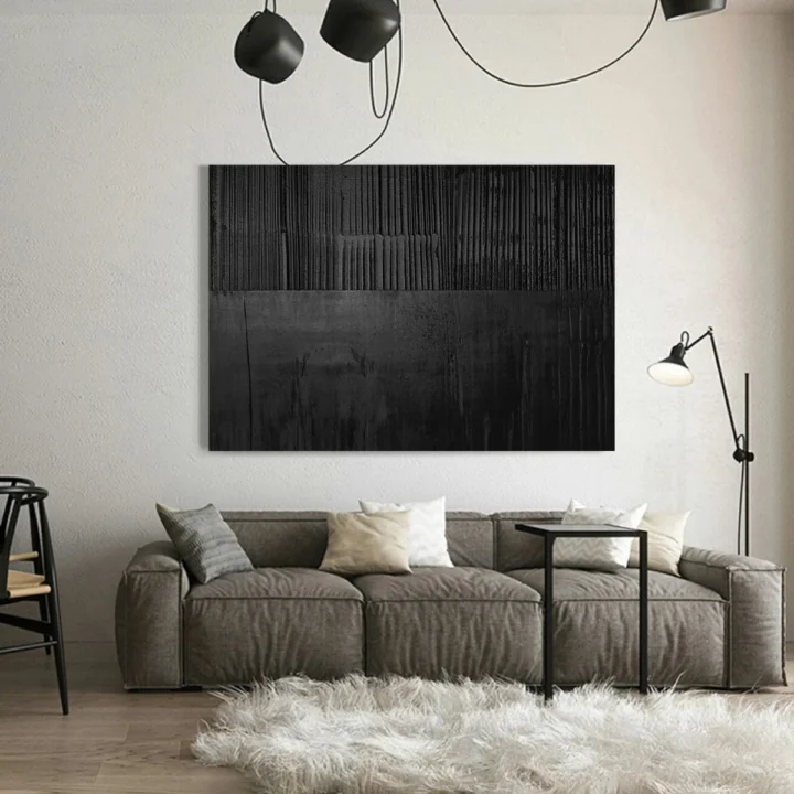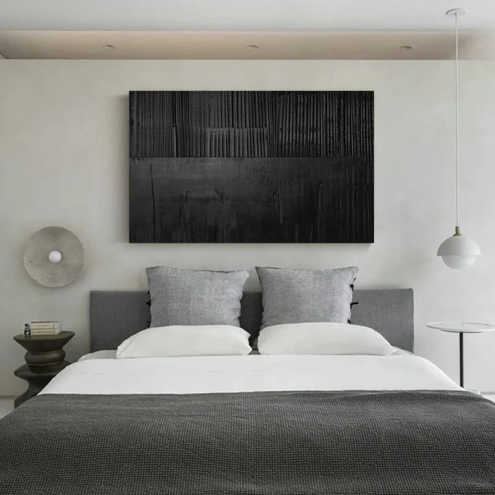 Bức tranh mang đến một cảm giác tĩnh lặng và sâu lắng với sự kết hợp của các tông màu đen và trắng. Hình khối đơn giản, không cầu kỳ, nhưng lại tạo nên một chiều sâu ấn tượng. Các đường nét mịn màng và bề mặt phẳng phiu tạo cảm giác hiện đại, thanh thoát. Mỗi chi tiết trong bức tranh như một nhịp điệu, dẫn dắt ánh nhìn vào không gian yên bình, nơi mà tâm hồn có thể nghỉ ngơi và suy tư. Đây là một tác phẩm nghệ thuật hoàn hảo cho những ai yêu thích sự tối giản và cảm giác sâu lắng.