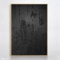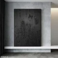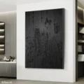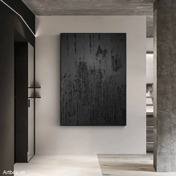 Bức tranh mang đến một không gian trầm lắng với tông màu đen chủ đạo, tạo cảm giác sâu lắng và tĩnh lặng. Kỹ thuật texture nổi được sử dụng để tạo ra những đường nét và hình khối độc đáo, thể hiện sự mạnh mẽ và chiều sâu. Bề mặt có sự tương phản giữa các lớp sơn, tạo nên hiệu ứng ánh sáng và bóng đổ, khiến người xem cảm nhận được sự sống động trong vẻ tĩnh mịch. Tác phẩm này phù hợp với không gian hiện đại, mang lại sự thanh thoát và cảm xúc sâu sắc cho người thưởng thức.