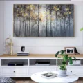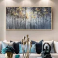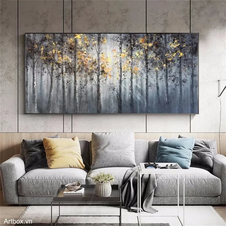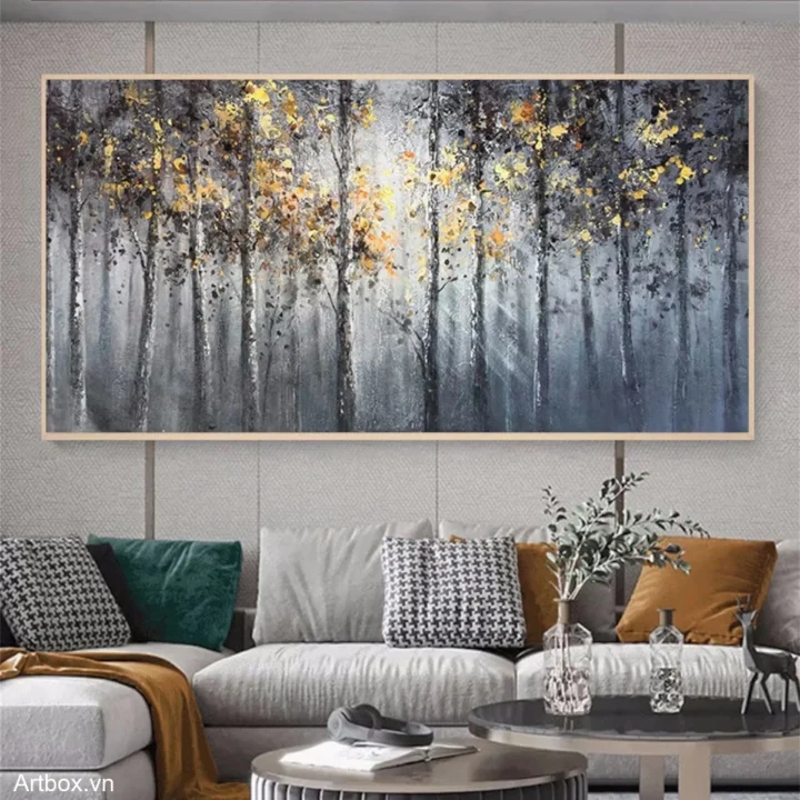 Bức tranh mang đến một khung cảnh rừng cây đầy huyền bí, với những tán lá vàng rực rỡ nổi bật giữa những thân cây màu xám và đen. Sự chuyển giao giữa ánh sáng và bóng tối tạo nên một không gian sâu lắng, mời gọi người xem bước vào thế giới tự nhiên tĩnh lặng. Kỹ thuật texture nổi không chỉ làm tăng chiều sâu cho bức tranh mà còn tạo cảm giác gần gũi, như thể bạn đang đứng giữa những cây cối thật sự. Màu sắc đa dạng hòa quyện với nhau, mang lại cảm giác thư giãn và bình yên, phù hợp cho các không gian sống hiện đại.