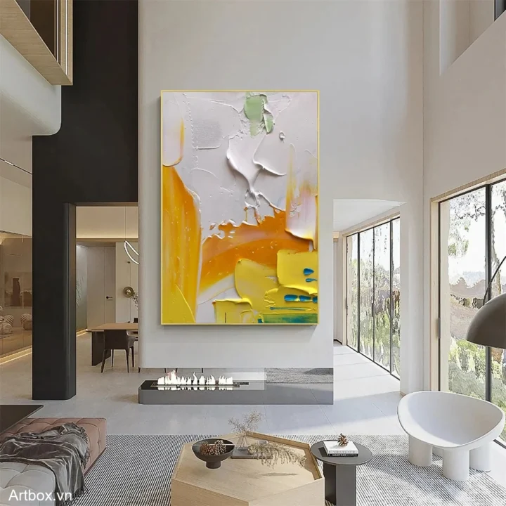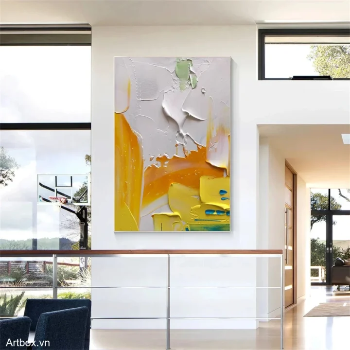 Bức tranh mang đến một cảm xúc tươi mới và tràn đầy năng lượng với sự kết hợp của các màu sắc rực rỡ như vàng, cam và xanh. Các lớp sơn dày được tạo ra bằng kỹ thuật texture nổi, tạo nên chiều sâu và sự sống động cho tác phẩm. Những hình khối trừu tượng và các đường nét mềm mại hòa quyện tạo nên một không gian nghệ thuật hiện đại, khơi gợi cảm hứng và sự sáng tạo. Đây là một tác phẩm lý tưởng cho những không gian sống và làm việc, mang lại cảm giác vui tươi và phấn khởi.