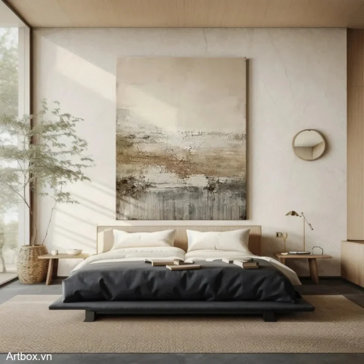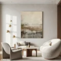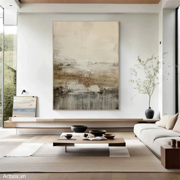 Bức tranh mang đến một cảm giác bình yên với những tông màu nâu be nhẹ nhàng, hòa quyện giữa các sắc thái ấm áp và trầm lắng. Kỹ thuật texture nổi tạo ra chiều sâu và sự sống động, khiến người xem cảm nhận được sự chuyển động và sự thay đổi trong không gian. Các đường nét mờ nhạt và những mảng màu hòa quyện khéo léo gợi lên hình ảnh của những vùng đất hoang sơ, khắc họa vẻ đẹp giản dị nhưng đầy sức sống. Đây là tác phẩm lý tưởng cho những không gian hiện đại, nơi mà sự tối giản và cảm xúc hòa quyện với nhau.