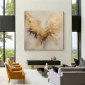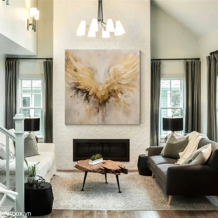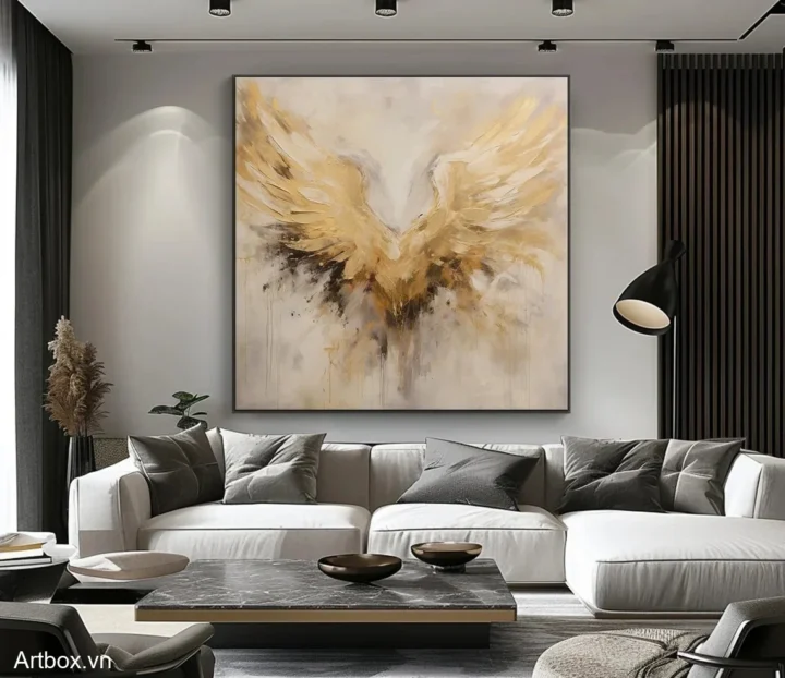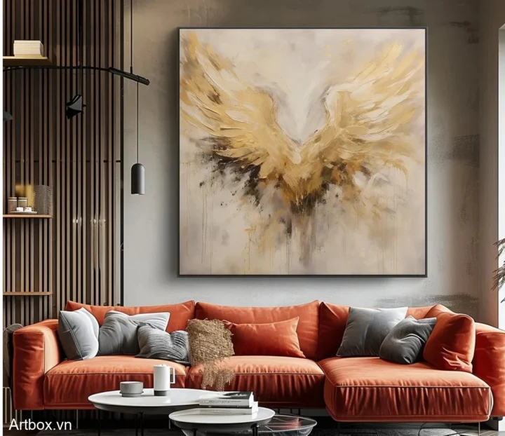 Bức tranh mang đến cảm giác mạnh mẽ và dịu nhẹ, với những sắc vàng và nâu hòa quyện tạo nên hình ảnh cánh thiên thần. Các đường nét mềm mại và chuyển động tự do thể hiện sự bay bổng, tự do. Texture nổi tạo chiều sâu cho tác phẩm, khiến người xem cảm nhận được sự sống động và năng lượng từ bức tranh. Màu sắc đa dạng nhưng không quá rực rỡ, tạo nên một không gian thư giãn, phù hợp với những không gian hiện đại và tinh tế. Bức tranh như một lời mời gọi đến cảm giác bình yên và tự do trong cuộc sống.