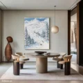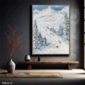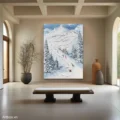 Bức tranh mang đến hình ảnh hùng vĩ của những ngọn núi phủ tuyết trắng xóa, tạo cảm giác yên bình và thanh tịnh. Những cây thông xanh mướt nổi bật giữa nền tuyết trắng, tạo nên sự tương phản rõ nét. Các vận động viên trượt tuyết với những sắc màu rực rỡ, như những điểm nhấn sống động giữa không gian yên ả của mùa đông. Kỹ thuật texture nổi được sử dụng mang lại chiều sâu cho bức tranh, khiến người xem cảm nhận được sự sống động của cảnh vật. Ánh sáng dịu dàng từ bầu trời xanh trong lành làm tăng thêm vẻ đẹp của khung cảnh, mang lại cảm giác tươi mới và tràn đầy năng lượng.