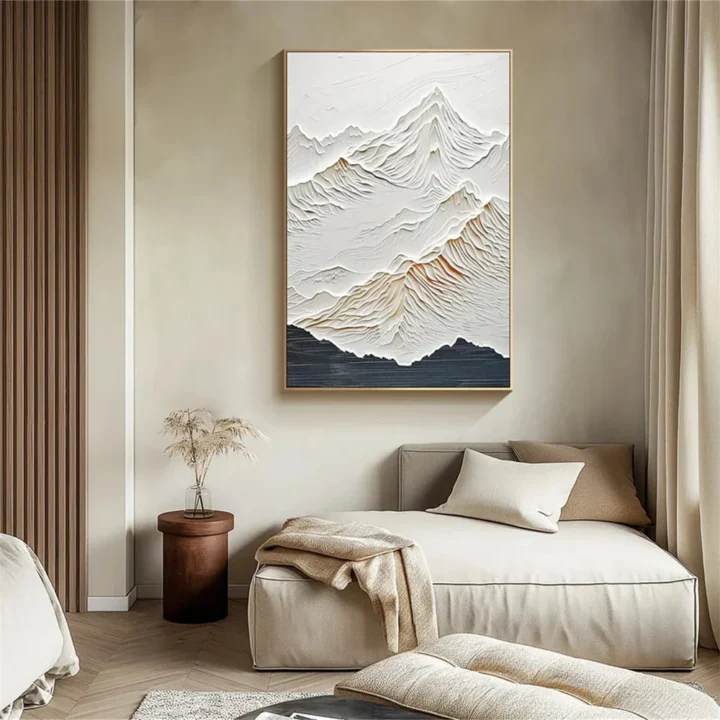 Bức tranh thể hiện một dãy núi hùng vĩ với các đường nét nổi bật, tạo cảm giác chiều sâu và kết cấu phong phú. Màu trắng chủ đạo, hòa quyện với những sắc thái nhẹ nhàng của màu be và xanh đậm ở chân núi, gợi lên sự thanh bình và tĩnh lặng. Kỹ thuật texture nổi mang đến cho tác phẩm một sức sống và cảm giác gần gũi với thiên nhiên. Ánh sáng và bóng đổ khéo léo tạo nên sự chuyển động cho bức tranh, khiến người xem như lạc vào một không gian yên ả, nơi mà vẻ đẹp tự nhiên được tôn vinh một cách tuyệt vời.