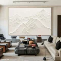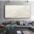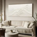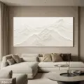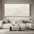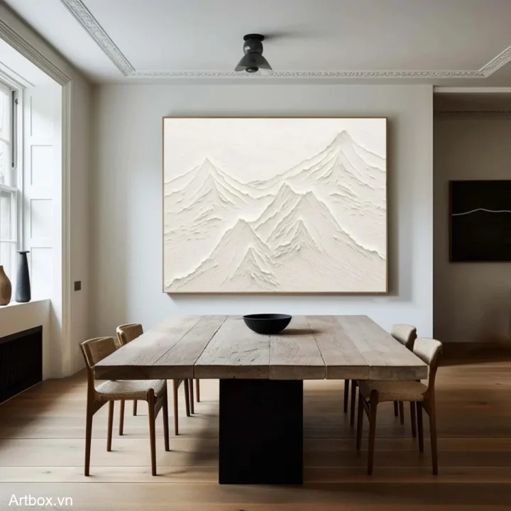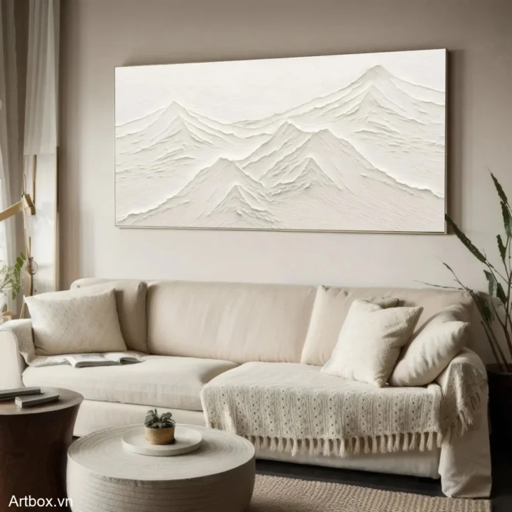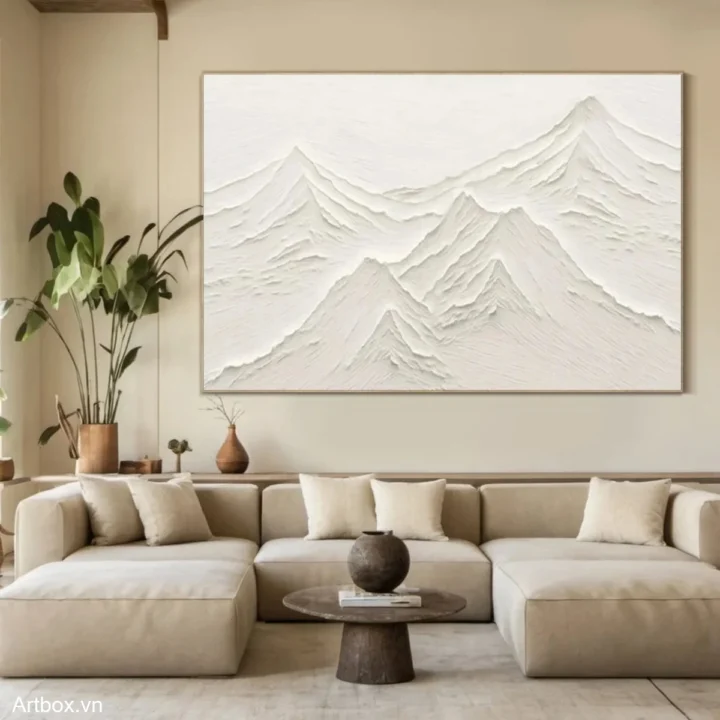 Bức tranh khắc họa những dãy núi hùng vĩ trong sắc trắng tinh khiết, tạo nên một không gian yên bình và tĩnh lặng. Kỹ thuật texture nổi mang đến chiều sâu cho từng đường nét, khiến cho cảnh vật như sống động hơn, hòa quyện với ánh sáng nhẹ nhàng. Sự đơn giản trong màu sắc và hình khối thể hiện vẻ đẹp tự nhiên, mộc mạc, dễ dàng hòa hợp với nhiều không gian sống. Bức tranh không chỉ là một tác phẩm nghệ thuật mà còn là một trải nghiệm cảm xúc, đưa người xem vào thế giới của sự thanh tịnh và thiền định.