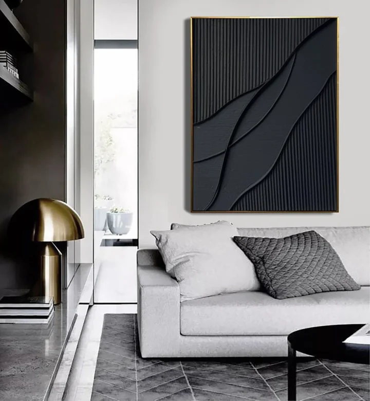 Bức tranh mang đến một cảm giác mạnh mẽ và bí ẩn với những đường nét uốn lượn, tạo ra chiều sâu và chuyển động. Các lớp sơn dày đặc được áp dụng khéo léo, tạo nên texture nổi bật, khiến người xem cảm nhận được sự sống động và năng lượng của tác phẩm. Màu đen chủ đạo không chỉ thể hiện sự sang trọng mà còn gợi lên những suy tư sâu lắng. Các đường cong và đường thẳng chồng chéo nhau, tạo ra một không gian nghệ thuật đầy sức hút, khơi gợi trí tưởng tượng và cảm xúc cho người chiêm ngưỡng.