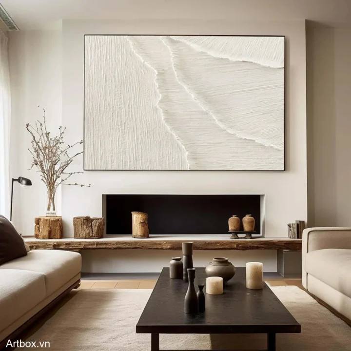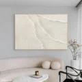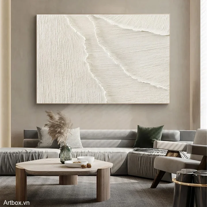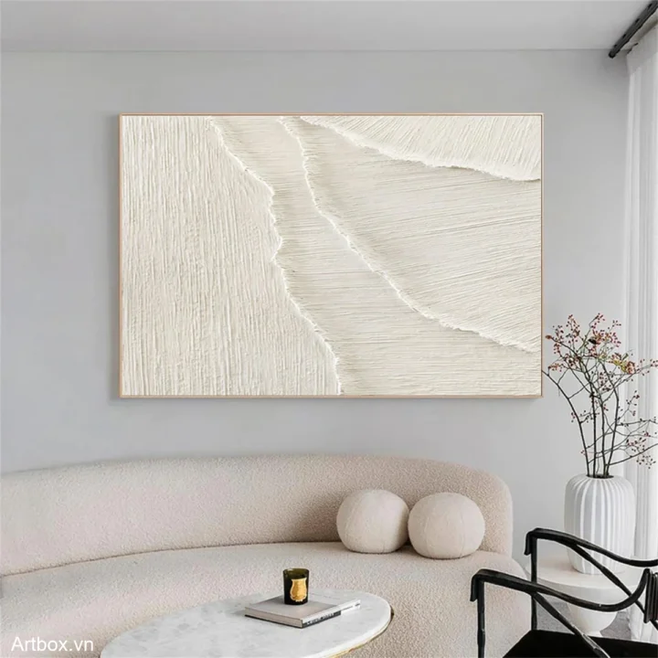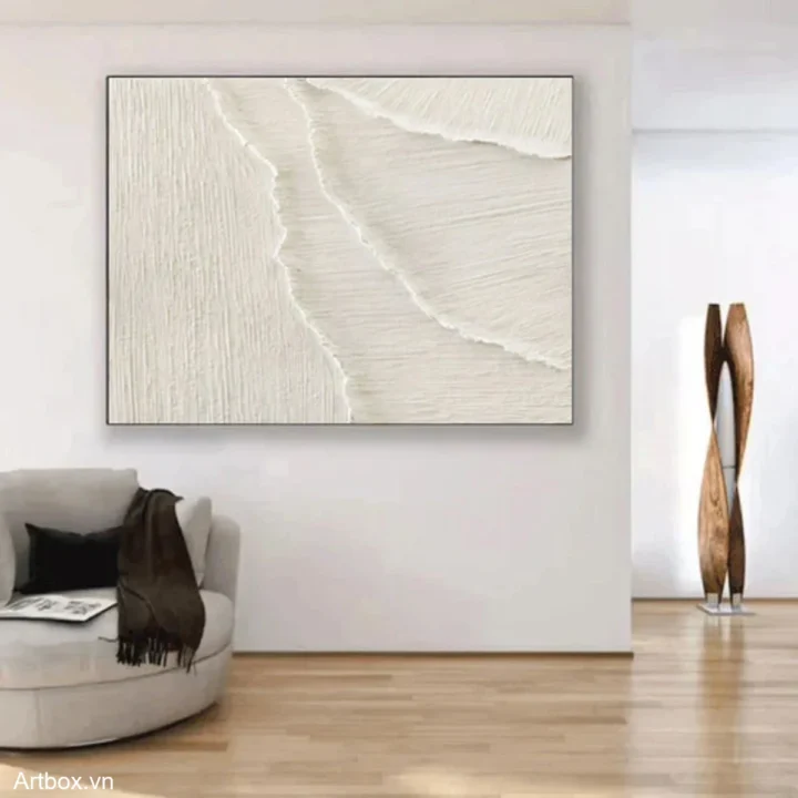 Bức tranh mang đến một cảm giác tĩnh lặng và thanh bình, với những đường nét mềm mại và tinh tế. Sự kết hợp giữa các lớp sơn tạo nên một bề mặt nổi bật, gợi nhớ đến những con sóng nhẹ nhàng vỗ về bờ cát. Tông màu trắng chủ đạo không chỉ mang lại cảm giác sạch sẽ mà còn tạo ra một không gian ấm cúng, gần gũi. Kỹ thuật texture nổi giúp bức tranh trở nên sống động hơn, như thể bạn có thể cảm nhận được từng nhịp thở của tự nhiên. Đây là một tác phẩm lý tưởng cho những ai yêu thích sự giản dị và thanh thoát trong nghệ thuật.