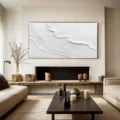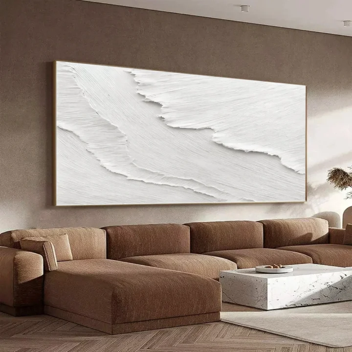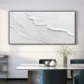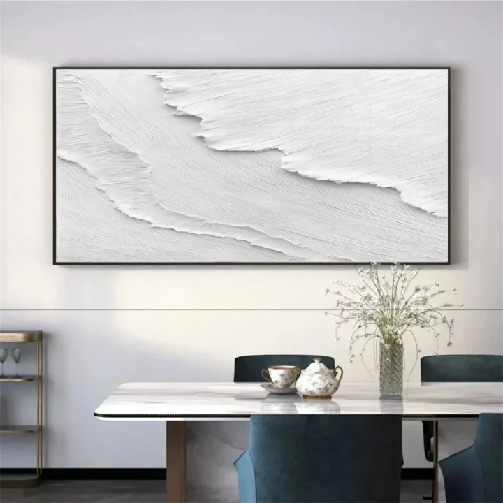 Bức tranh mang đến một cảm giác tĩnh lặng và thanh thoát với những đường nét mềm mại, uốn lượn. Màu trắng chủ đạo tạo nên sự tinh khiết, đồng thời thể hiện sự chuyển động nhẹ nhàng như dòng nước. Kỹ thuật texture nổi được sử dụng khéo léo, tạo chiều sâu và sức sống cho bức tranh. Những đường chéo, gợn sóng như gợi lên hình ảnh của thiên nhiên, mời gọi người xem bước vào một thế giới yên bình. Tác phẩm không chỉ là một điểm nhấn nghệ thuật mà còn là một không gian thư giãn, giúp tâm hồn lắng đọng và tìm thấy sự bình yên.