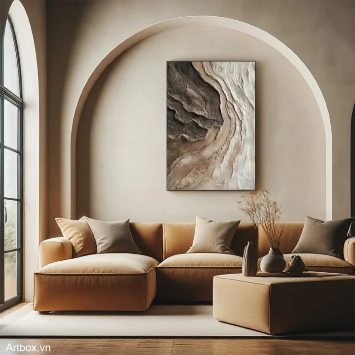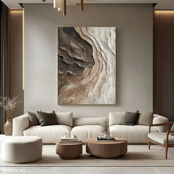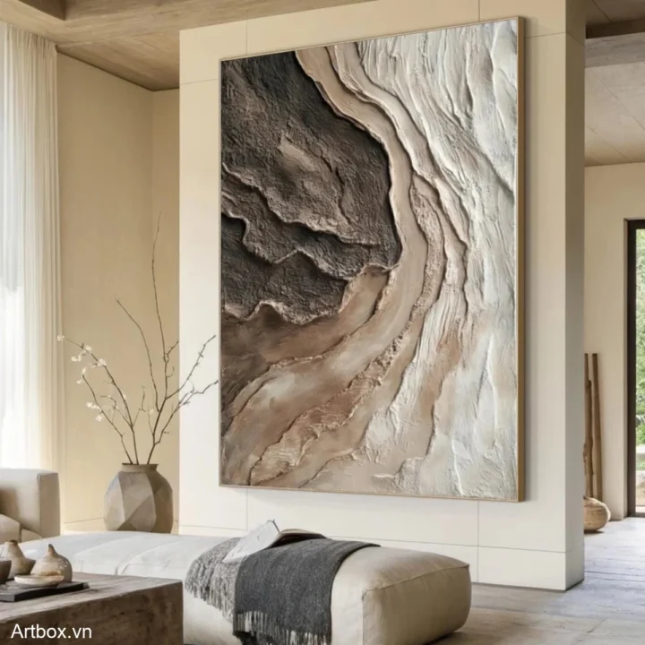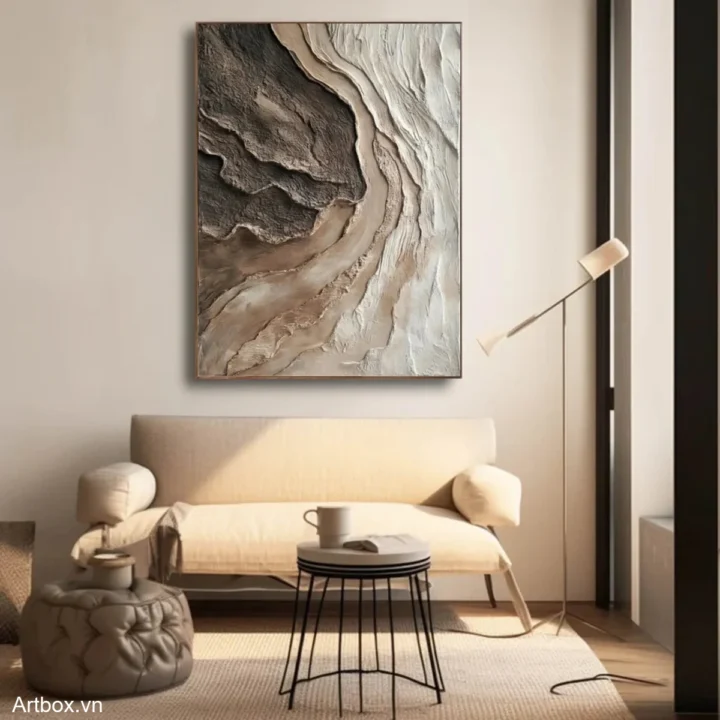 Bức tranh mang đến cảm giác tĩnh lặng và ấm áp với những đường nét uốn lượn, tạo hình ảnh như dòng chảy của đất và nước. Sự kết hợp giữa các tông màu nâu be và trắng tạo nên chiều sâu và sự phong phú cho tác phẩm, khiến người xem cảm nhận được sự chuyển động nhẹ nhàng của không gian. Kỹ thuật texture nổi làm nổi bật các chi tiết, mang lại cảm giác thực và gần gũi. Đây là một tác phẩm lý tưởng cho những không gian hiện đại, mang lại sự thư giãn và cảm hứng cho người chiêm ngưỡng.