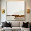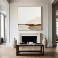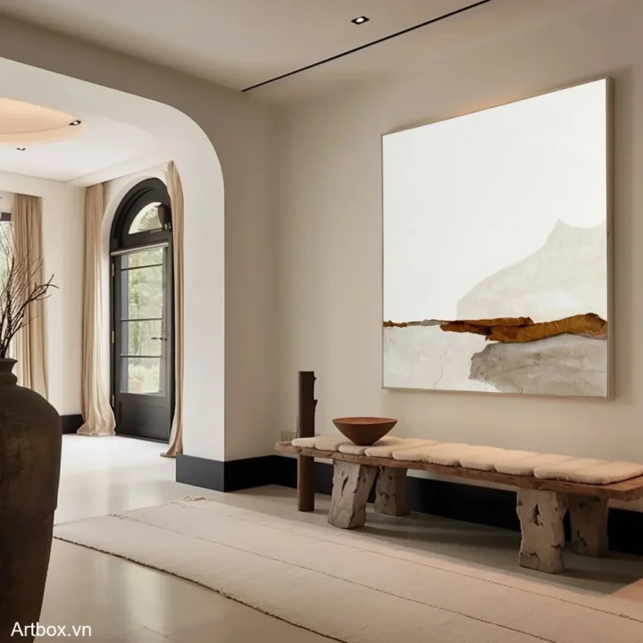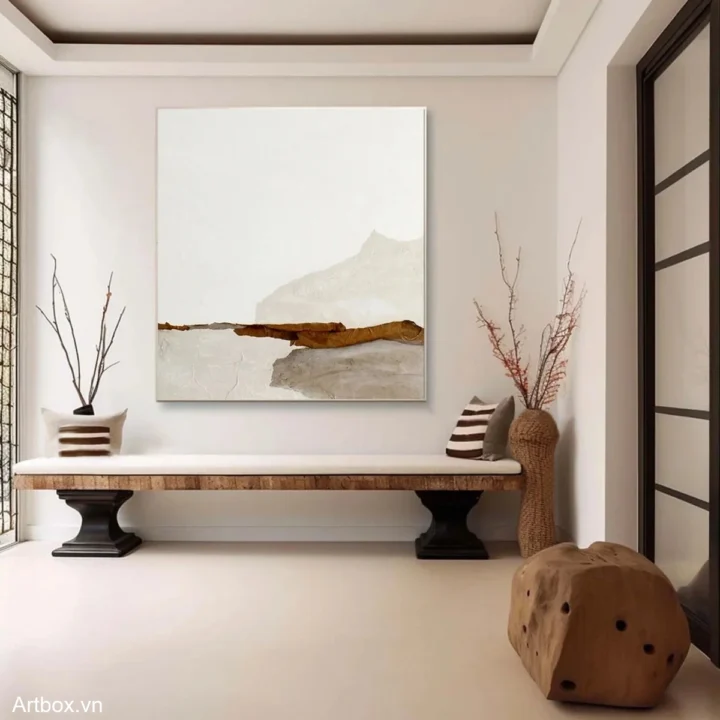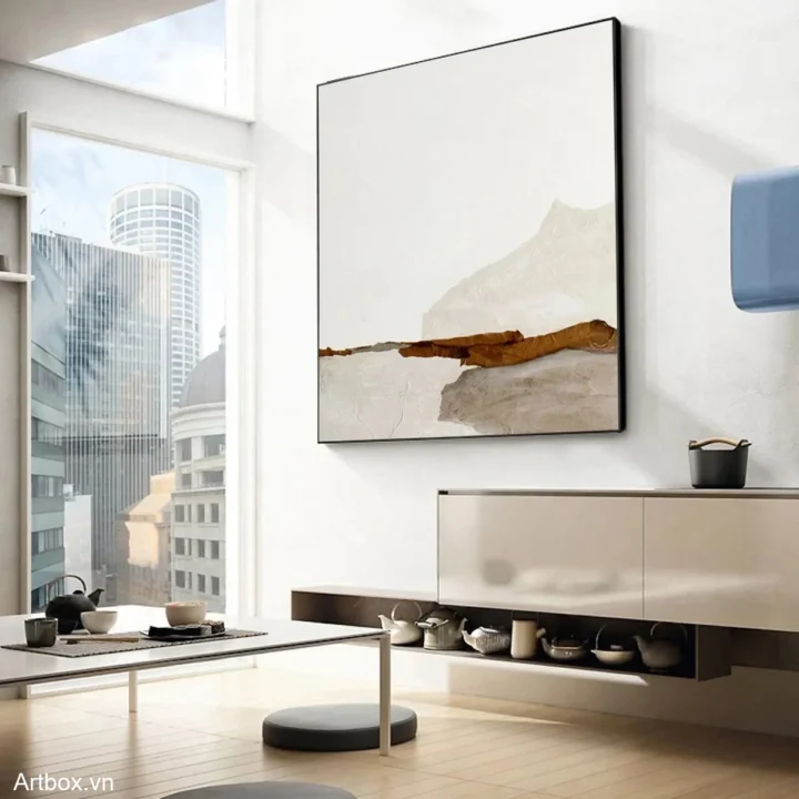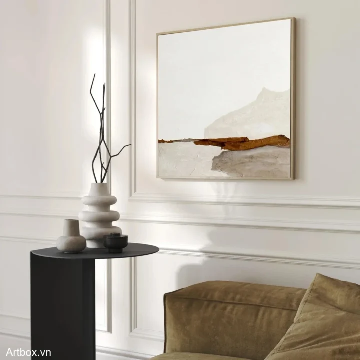 Bức tranh mang đến một cảm giác yên bình và nhẹ nhàng, với các lớp màu nâu be nhạt hòa quyện tạo thành những đường nét trừu tượng. Kỹ thuật texture nổi được sử dụng khéo léo, tạo chiều sâu và cảm giác sống động cho tác phẩm. Những mảng màu sắc đơn giản nhưng tinh tế gợi lên hình ảnh của một dòng chảy tĩnh lặng, như một khung cảnh thiên nhiên được chắt lọc. Phong cách hiện đại và tối giản góp phần làm nổi bật vẻ đẹp tự nhiên và sự thanh thoát của bức tranh, phù hợp với nhiều không gian sống khác nhau.
