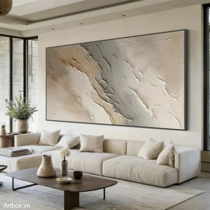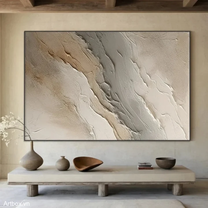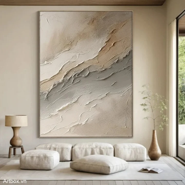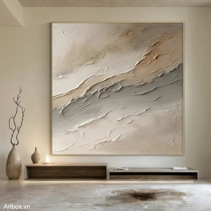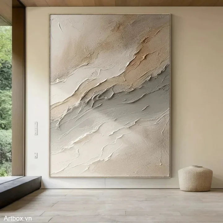 Bức tranh mang đến cảm giác tĩnh lặng và ấm áp với các lớp màu nâu be nhẹ nhàng hòa quyện vào nhau. Những đường nét uốn lượn và texture nổi tạo ra chiều sâu, khiến người xem như lạc vào một không gian yên bình. Sự kết hợp giữa các sắc thái khác nhau của màu nâu và be không chỉ tạo nên sự hài hòa mà còn thể hiện một sự chuyển động nhẹ nhàng, gợi nhớ đến dòng chảy của nước. Phong cách hiện đại và tối giản của bức tranh khiến nó trở thành điểm nhấn hoàn hảo cho bất kỳ không gian nào, từ phòng khách đến phòng làm việc.