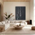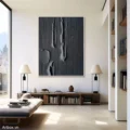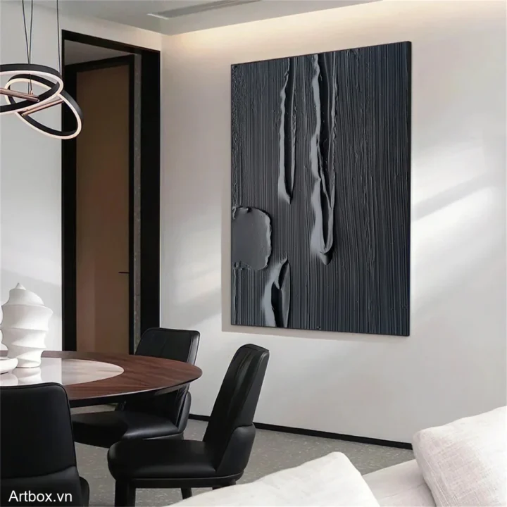 Bức tranh mang đến một cảm giác tĩnh lặng và sâu lắng với các đường nét nổi bật, tạo nên một không gian trừu tượng đầy chiều sâu. Các lớp sơn xám được trải đều, hòa quyện với nhau, tạo ra những vệt chảy mềm mại, như dòng nước lặng lẽ trôi. Sự kết hợp giữa texture nổi và màu sắc tối giản tạo ra một tác phẩm nghệ thuật vừa hiện đại vừa thanh thoát, phù hợp với những không gian cần sự thư giãn và tập trung. Bức tranh không chỉ là một điểm nhấn trong không gian mà còn là một tác phẩm khơi gợi cảm xúc và suy tư.