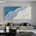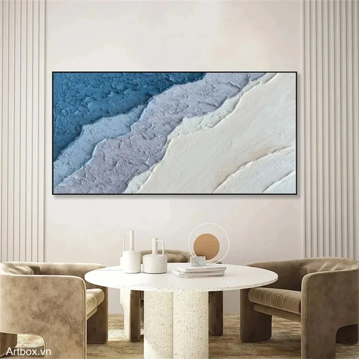 Bức tranh mang đến một cảm giác tĩnh lặng và sâu lắng với sự kết hợp hài hòa giữa các sắc thái xanh dương và trắng. Những đường nét uốn lượn cùng với texture nổi tạo ra chiều sâu và sự sống động, như thể hiện một dòng chảy nhẹ nhàng của nước. Màu sắc mát mẻ và dịu dàng giúp kích thích cảm giác thư giãn, thích hợp cho không gian sống hiện đại. Bức tranh không chỉ là một tác phẩm nghệ thuật mà còn là một phần của cảm xúc, mang lại sự bình yên cho những ai chiêm ngưỡng.