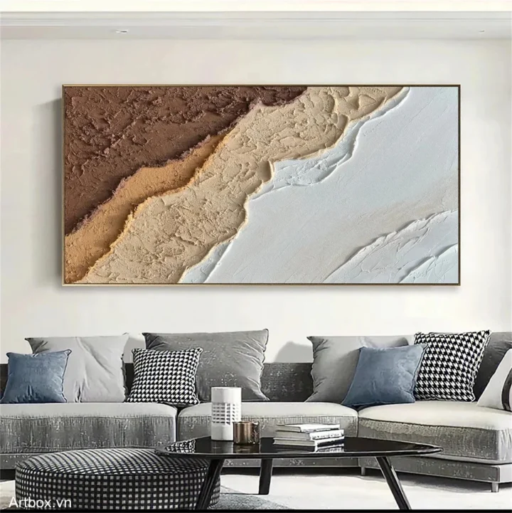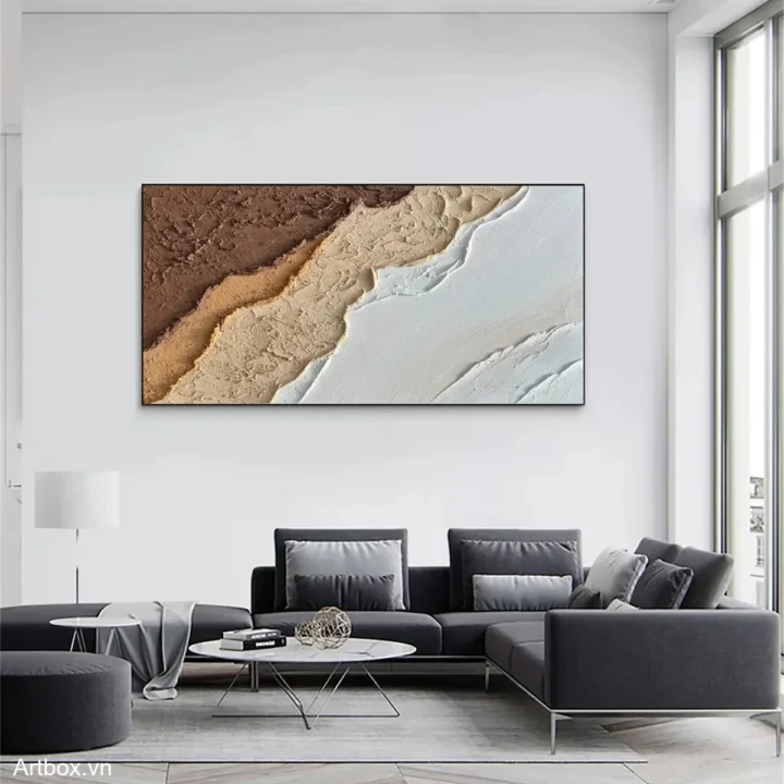 Bức tranh mang đến một không gian tĩnh lặng và thư giãn với những đường nét mềm mại, uốn lượn như dòng chảy tự nhiên. Sự kết hợp giữa các tông màu nâu be và trắng tạo nên cảm giác ấm áp, gần gũi. Kỹ thuật texture nổi được sử dụng khéo léo, mang lại chiều sâu và sự sống động cho tác phẩm, khiến người xem có cảm giác như đang chạm vào những lớp đất, cát và nước. Đây là một tác phẩm nghệ thuật hiện đại, phù hợp cho không gian sống và làm việc, mang lại cảm giác bình yên và dễ chịu cho tâm hồn.