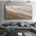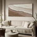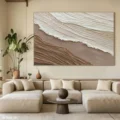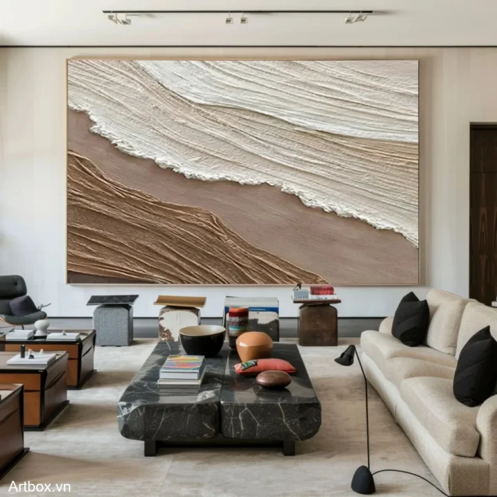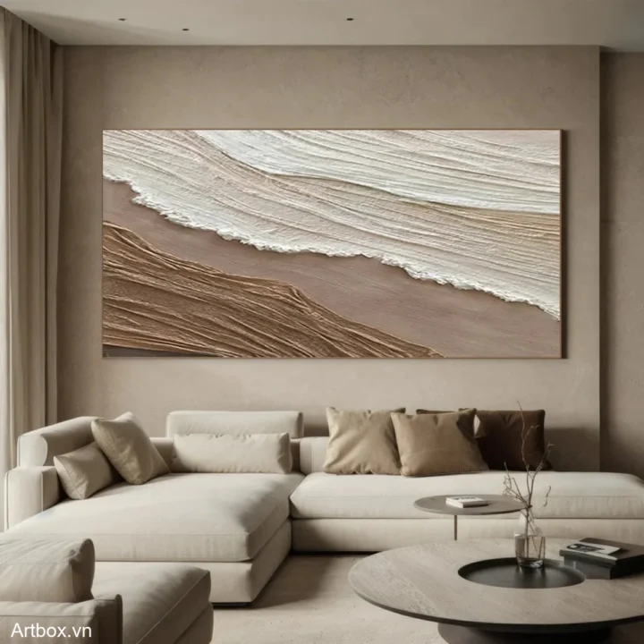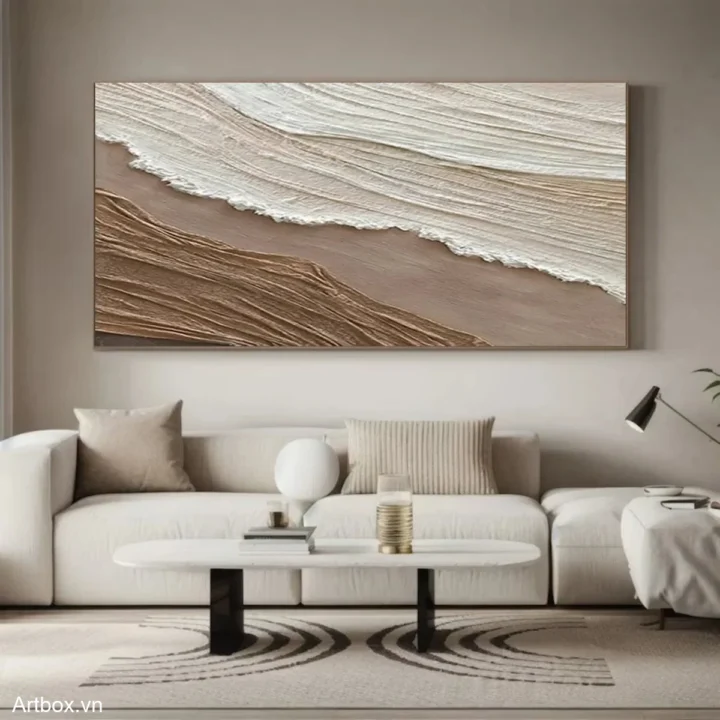 Bức tranh mang đến cảm giác bình yên và gần gũi, với các lớp màu nâu be và trắng được tạo hình bằng kỹ thuật texture nổi. Những đường nét uốn lượn, mềm mại như dòng chảy của nước, gợi nhớ đến vẻ đẹp tự nhiên của đất và cát. Sự kết hợp giữa các tông màu nhẹ nhàng tạo nên một không gian thư thái, dễ chịu, phù hợp cho những ai tìm kiếm sự tĩnh lặng trong cuộc sống. Phong cách hiện đại và tối giản được thể hiện rõ nét, giúp bức tranh trở thành điểm nhấn tinh tế cho không gian sống hiện đại.