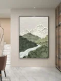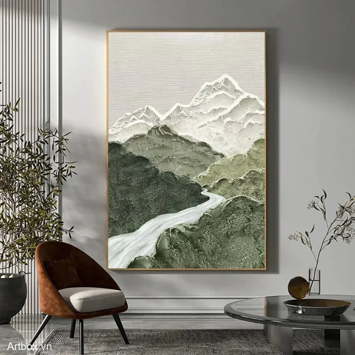 Bức tranh mang đến một khung cảnh thiên nhiên hùng vĩ với những dãy núi xanh mướt, được thể hiện qua kỹ thuật texture nổi, tạo chiều sâu và cảm giác sống động. Dòng sông uốn lượn giữa những ngọn đồi, mang lại sự yên bình và tĩnh lặng. Những gam màu xanh lá chủ đạo kết hợp với các sắc thái nhẹ nhàng khác, tạo nên một không gian thư giãn, gần gũi với thiên nhiên. Phong cách hiện đại kết hợp với cảm hứng Wabi-Sabi, mang đến vẻ đẹp mộc mạc, tự nhiên và ấm áp, phù hợp với nhiều không gian sống hiện đại.