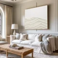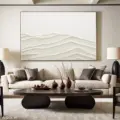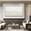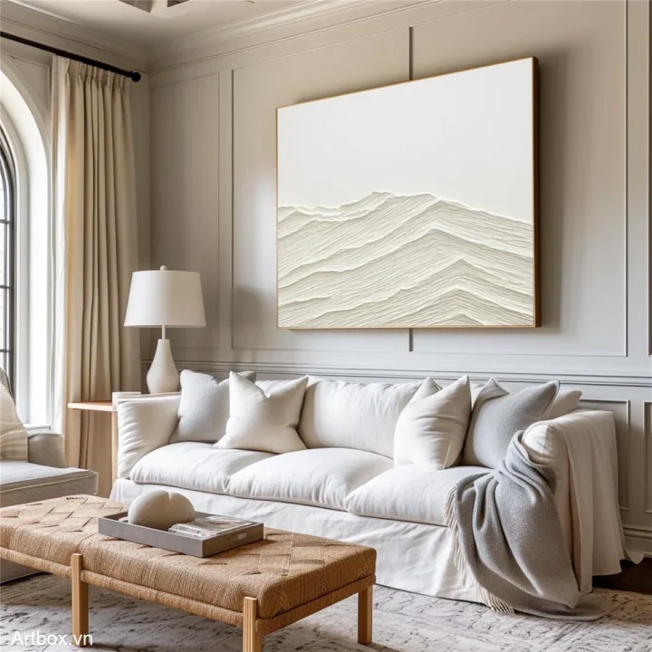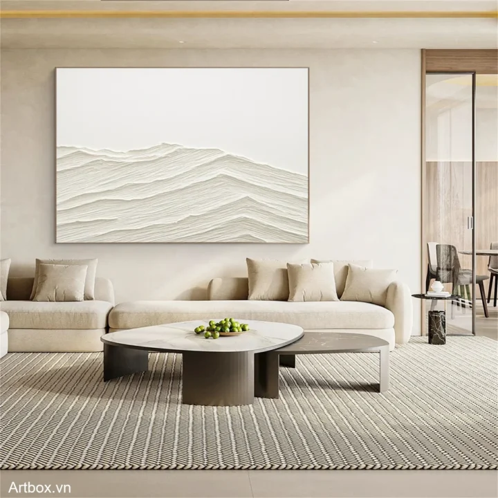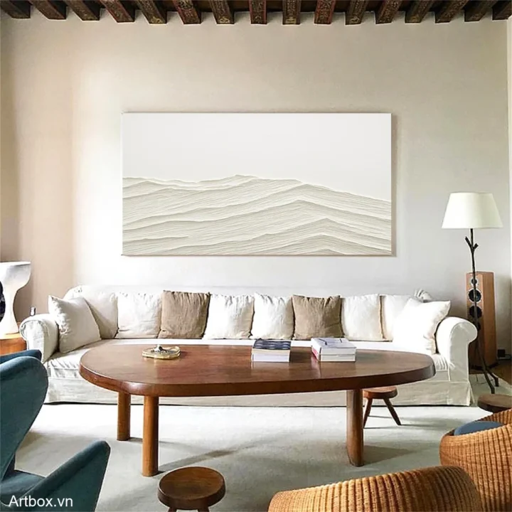 Bức tranh mang đến một cảm giác tĩnh lặng và thanh bình qua những đường nét uốn lượn nhẹ nhàng, tạo nên hình ảnh của những ngọn đồi hoặc sóng nước. Màu be nhẹ nhàng, kết hợp với kỹ thuật texture nổi, tạo chiều sâu và sự sống động cho tác phẩm. Những lớp màu chồng lên nhau không chỉ thể hiện sự chuyển động mà còn tạo ra cảm giác ấm áp, gần gũi. Đây là một tác phẩm nghệ thuật thích hợp cho không gian sống hiện đại, mang lại sự thư giãn và nhẹ nhàng cho tâm hồn.