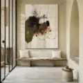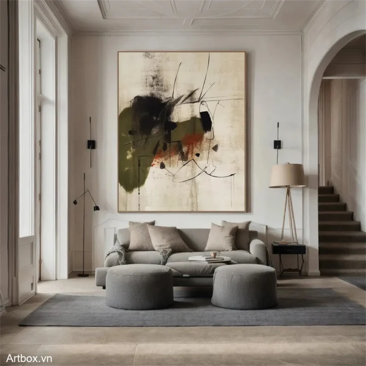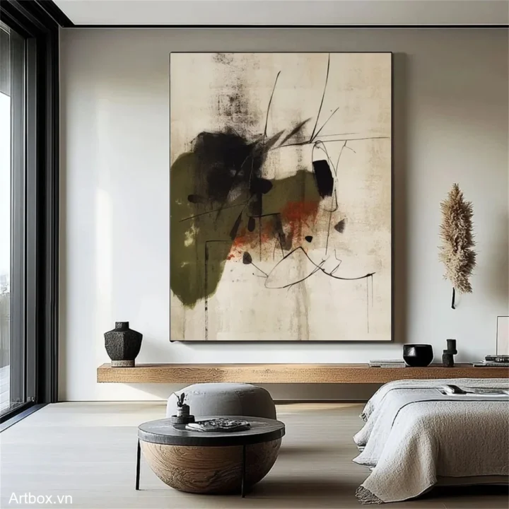 Bức tranh mang đến một cảm giác tĩnh lặng và sâu lắng với những nét vẽ trừu tượng. Các mảng màu đen, xanh lá và một chút đỏ hòa quyện với nhau, tạo nên một sự tương phản mạnh mẽ nhưng vẫn giữ được sự hài hòa. Những đường nét mảnh mai chạy ngang dọc, như những giai điệu âm nhạc, khiến người xem cảm thấy như đang lạc vào một không gian nghệ thuật đầy cảm xúc. Kỹ thuật vẽ phẳng giúp cho bức tranh trở nên hiện đại và tinh tế, phù hợp với những không gian cần sự tập trung và sáng tạo.