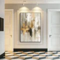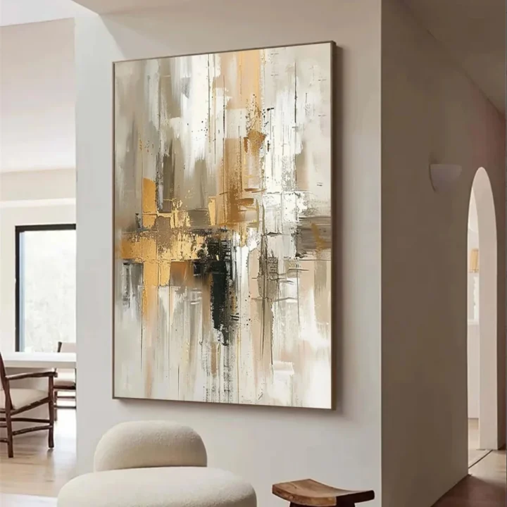 Bức tranh mang đến một không gian sống động với sự hòa quyện giữa các tông màu vàng, trắng và đen. Những đường nét mạnh mẽ và các khối hình được sắp xếp một cách tinh tế tạo nên một tác phẩm nghệ thuật trừu tượng đầy sức cuốn hút. Texture nổi giúp bức tranh thêm phần sâu sắc, tạo cảm giác như đang chuyển động. Ánh sáng vàng ấm áp cùng các mảng màu tương phản mạnh mẽ mang lại cảm xúc tươi mới và năng lượng tích cực cho không gian. Đây là một tác phẩm hoàn hảo cho những ai yêu thích sự hiện đại và nghệ thuật đương đại.