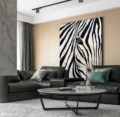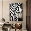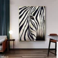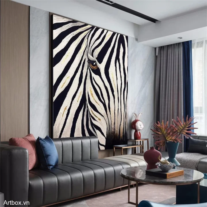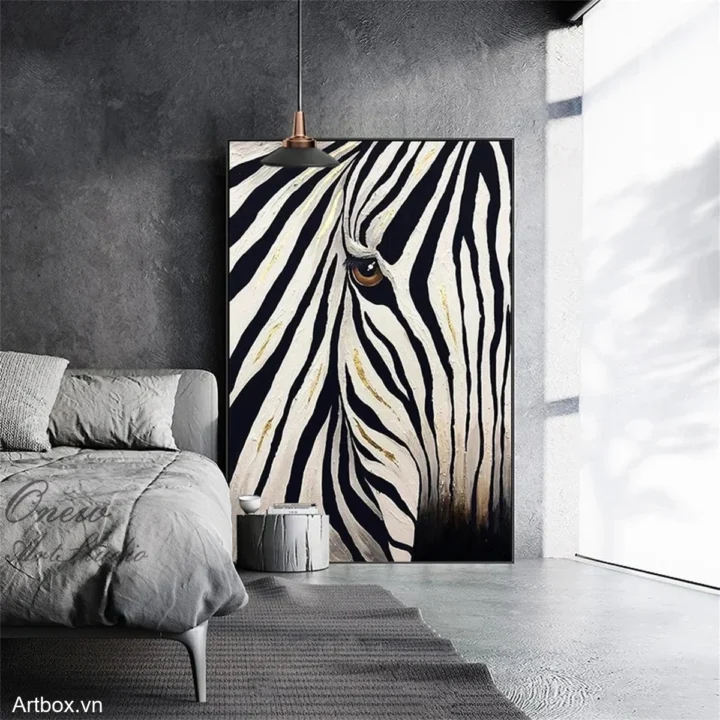 Bức tranh khắc họa một góc nhìn gần gũi về một chú ngựa vằn, với những đường sọc đen trắng nổi bật, tạo nên sự tương phản mạnh mẽ và cuốn hút. Nét vẽ texture nổi mang lại chiều sâu cho hình ảnh, khiến người xem như có thể cảm nhận được sự sống động của từng đường nét. Đôi mắt của chú ngựa vằn, với ánh sáng ấm áp, tạo điểm nhấn đầy cảm xúc, gợi lên sự tò mò và kết nối. Bức tranh không chỉ thể hiện vẻ đẹp của động vật mà còn phản ánh sự mạnh mẽ, tự nhiên và tinh tế, phù hợp với không gian hiện đại.