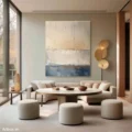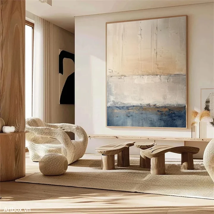 Bức tranh mang đến cảm giác bình yên với sự kết hợp hài hòa giữa các tông màu xanh dương và trắng. Những lớp sơn dày tạo ra texture nổi, đem lại chiều sâu và sức sống cho tác phẩm. Phần trên của bức tranh được tô điểm bằng màu trắng sáng, tượng trưng cho bầu trời, trong khi phần dưới là những gam màu xanh dương đậm, gợi nhớ đến mặt nước lặng lẽ. Sự giao thoa giữa hai yếu tố này tạo nên một không gian tĩnh lặng, thanh thoát, mời gọi người xem lắng đọng tâm hồn và tìm kiếm sự thư giãn trong cuộc sống bận rộn.