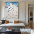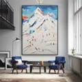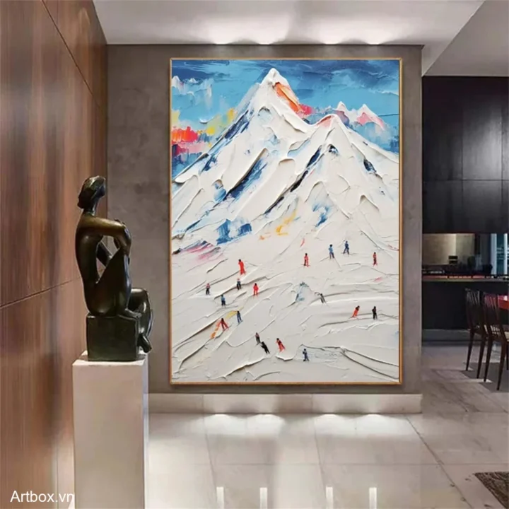 Bức tranh mang đến cảm giác mạnh mẽ và vui tươi với hình ảnh những ngọn núi tuyết cao chót vót, được khắc họa bằng kỹ thuật texture nổi. Những sắc màu rực rỡ từ xanh dương, đỏ, đến vàng hòa quyện tạo nên một không gian sống động, như một bức tranh thiên nhiên tuyệt đẹp. Các nhân vật nhỏ bé đang chinh phục những đỉnh núi, thể hiện sự dũng cảm và quyết tâm. Cảm xúc mãnh liệt từ bức tranh khiến người xem như hòa mình vào cuộc hành trình khám phá thiên nhiên hùng vĩ và đầy thử thách.