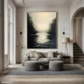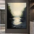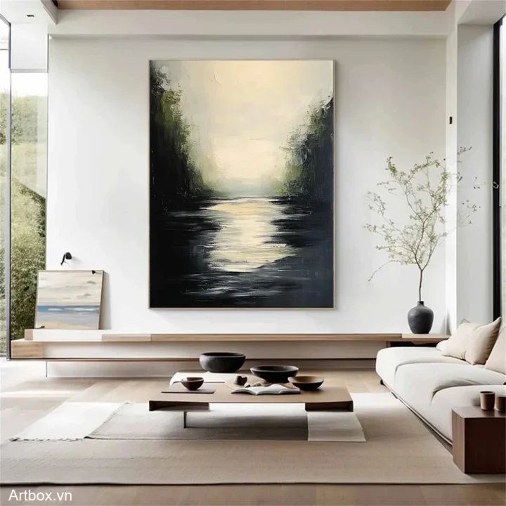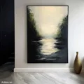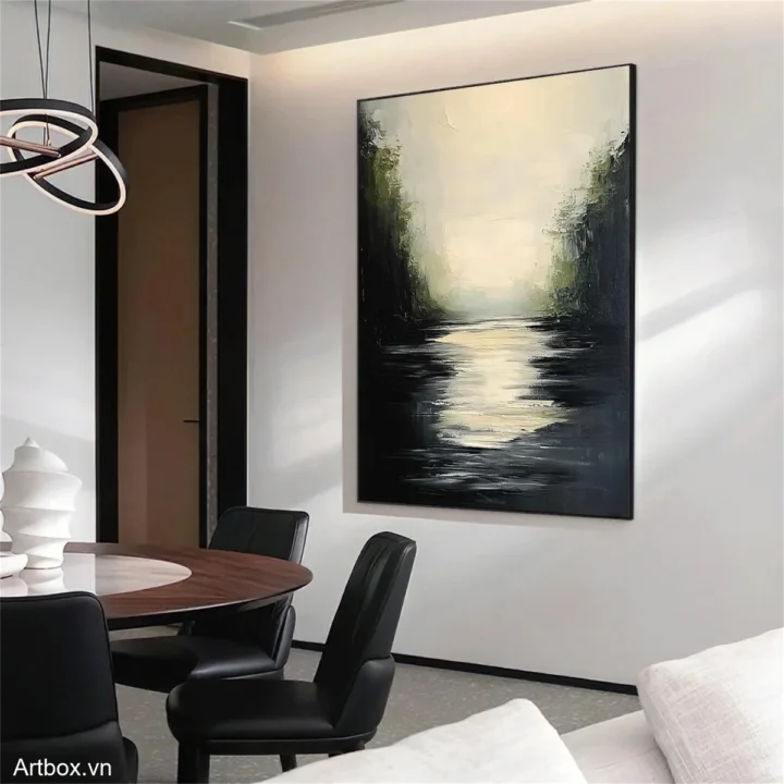 Bức tranh mang đến cảm giác yên bình và tĩnh lặng, với hình ảnh mặt hồ phản chiếu ánh sáng mờ ảo của bầu trời. Màu xanh lá và màu đen hòa quyện tạo nên một không gian thư giãn, như một buổi sớm sương mù. Kỹ thuật texture nổi làm nổi bật chiều sâu và sự sống động của cảnh vật, khiến người xem cảm nhận được sự gần gũi với thiên nhiên. Đây là tác phẩm lý tưởng cho những ai tìm kiếm sự tĩnh lặng trong không gian sống hoặc làm việc của mình.