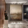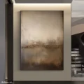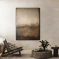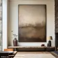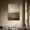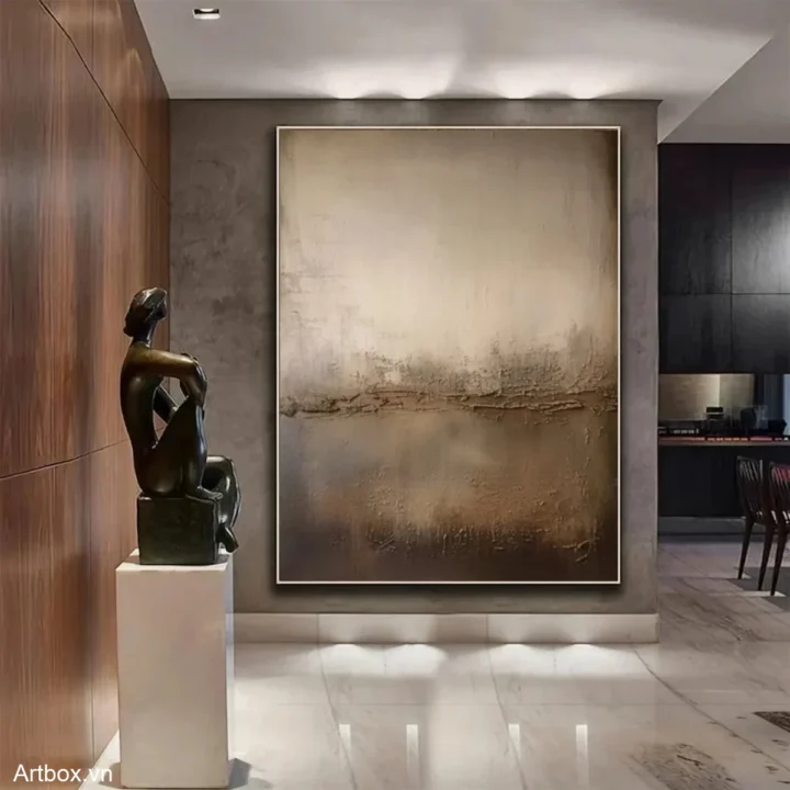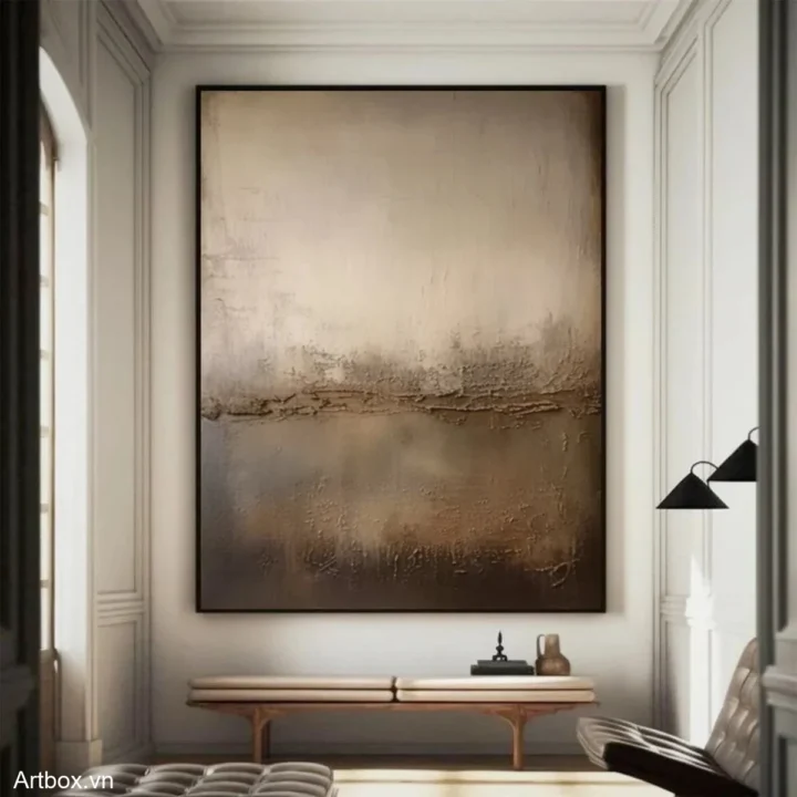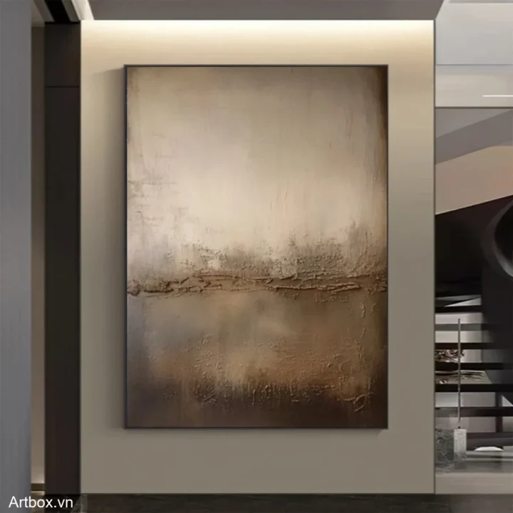 Bức tranh mang đến cảm giác hòa quyện giữa đất và trời, với những tông màu nâu be ấm áp, tạo nên một không gian thư giãn và gần gũi. Kỹ thuật texture nổi tạo chiều sâu, khiến bề mặt tranh trở nên sống động và hấp dẫn. Những đường nét mềm mại, mờ ảo gợi lên hình ảnh của cảnh vật thiên nhiên, như làn sương mù nhẹ nhàng bao phủ mặt đất. Bức tranh không chỉ là một tác phẩm nghệ thuật mà còn là một trải nghiệm cảm xúc, đưa người xem vào một thế giới bình yên và tĩnh lặng.
