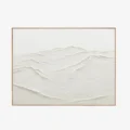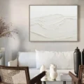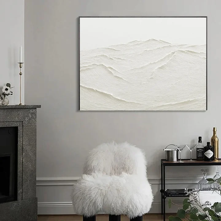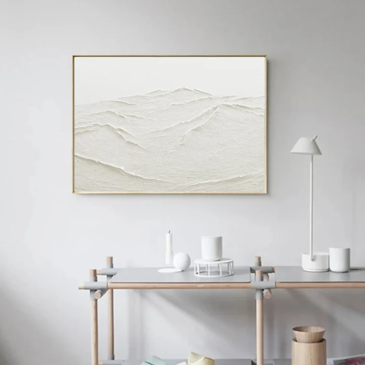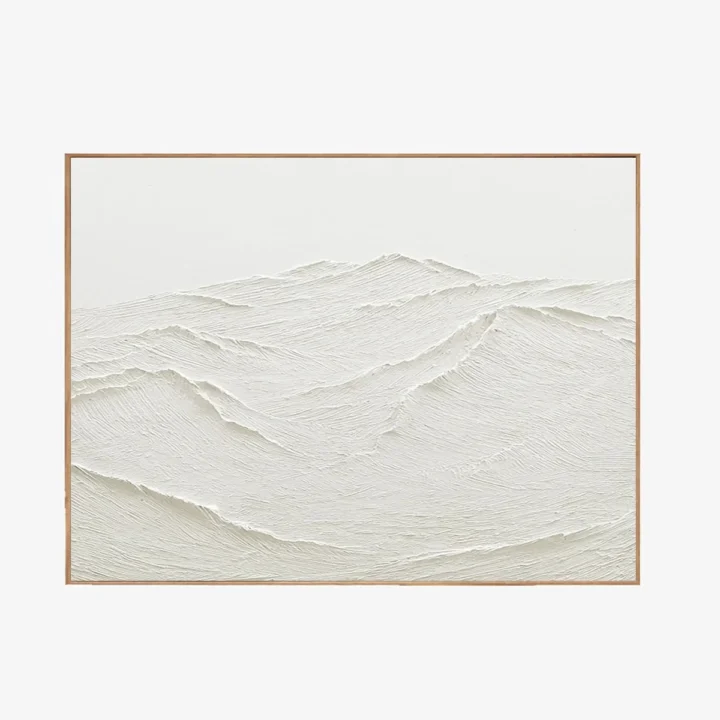 Bức tranh mang đến cảm giác nhẹ nhàng và thanh thoát với những đường nét uốn lượn như sóng biển. Màu trắng tinh khiết tạo nên sự tinh tế và thanh lịch, trong khi kỹ thuật texture nổi khiến cho bề mặt tranh trở nên sống động và gần gũi. Những lớp sóng chồng chéo nhau tạo ra chiều sâu, giống như những kỷ niệm trôi dạt trong tâm trí. Với phong cách hiện đại và Wabi-Sabi, tác phẩm này không chỉ là một bức tranh mà còn là một trải nghiệm nghệ thuật, gợi lên cảm xúc ấm áp và sự thư giãn trong không gian sống.