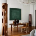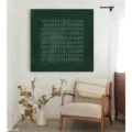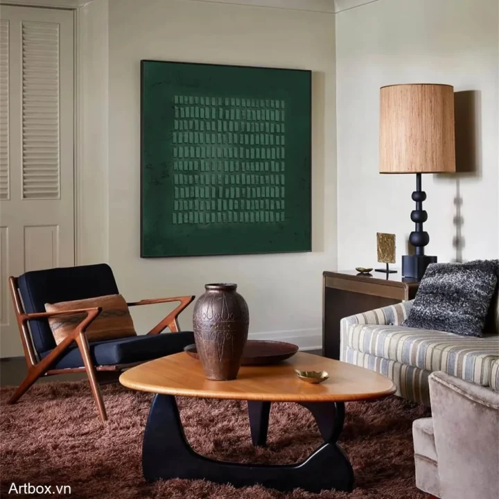 Bức tranh mang đến một không gian trừu tượng với nền xanh ngọc mát mắt, tạo cảm giác thư giãn và dễ chịu. Các hình khối được sắp xếp một cách tinh tế, tạo nên một bản giao hưởng của màu sắc và hình dạng, khiến người xem dễ dàng bị cuốn hút vào chiều sâu của tác phẩm. Sự đơn giản trong kỹ thuật vẽ phẳng làm nổi bật vẻ đẹp của màu sắc, mang lại cảm giác hiện đại và thanh thoát. Bức tranh không chỉ là một tác phẩm nghệ thuật mà còn là một điểm nhấn tinh tế cho không gian sống, đem lại sự tươi mới và sức sống cho căn phòng.