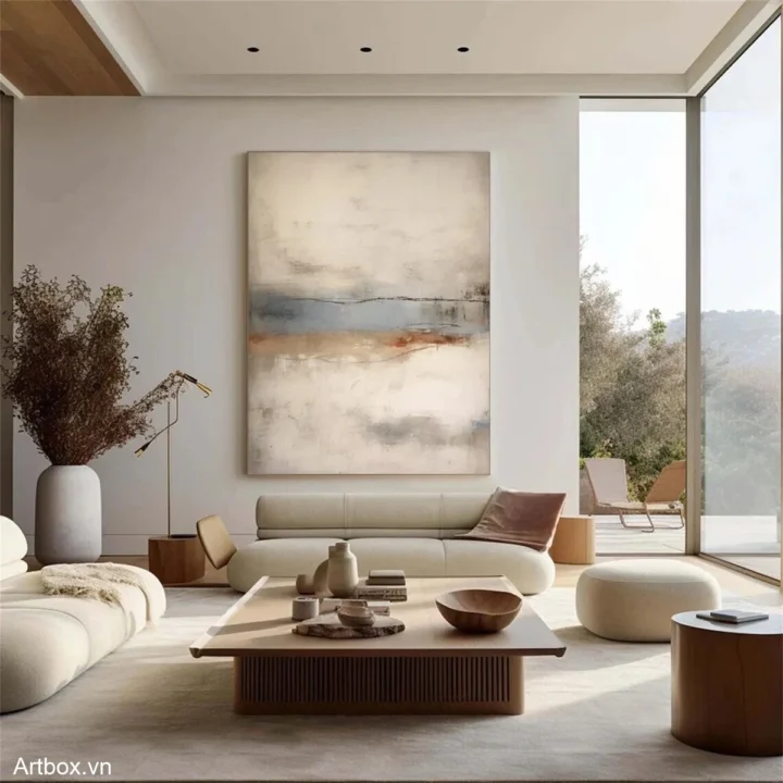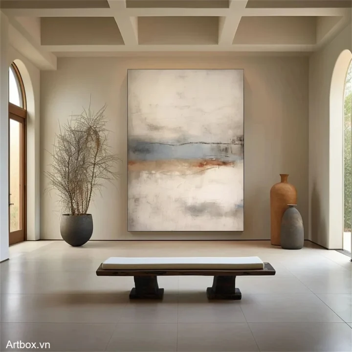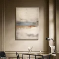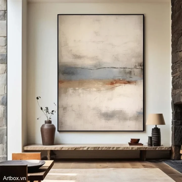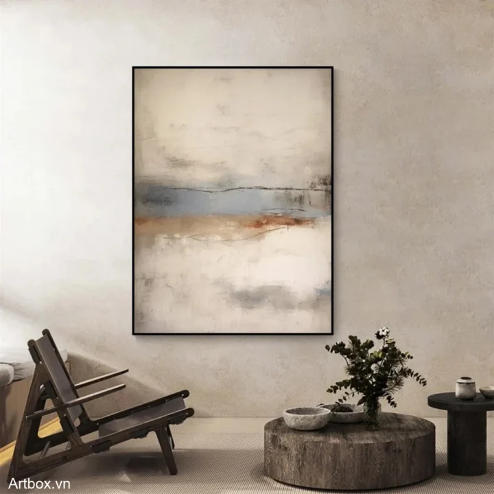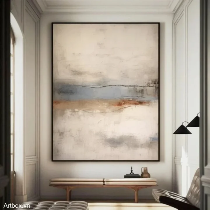 Bức tranh mang đến một không gian tĩnh lặng và thư giãn với các gam màu nhẹ nhàng hòa quyện. Những đường nét mềm mại và sự chuyển tiếp giữa các tông màu như xanh nhạt, nâu ấm và trắng tạo nên một bức tranh trừu tượng, đầy cảm xúc. Cảm giác như đang nhìn thấy một cảnh quan mờ ảo, nơi mà ánh sáng và bóng tối giao thoa. Với phong cách hiện đại và tối giản, tác phẩm này không chỉ là một điểm nhấn nghệ thuật mà còn là một nguồn cảm hứng cho sự sáng tạo và thư giãn trong không gian sống.