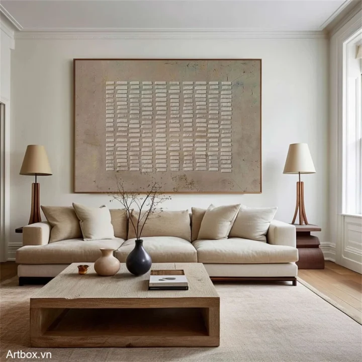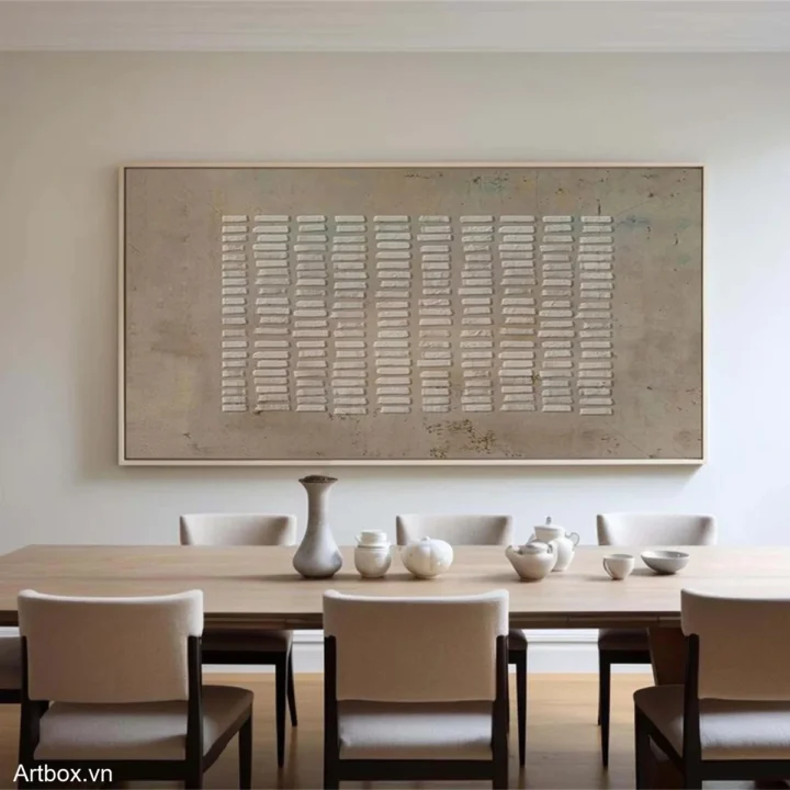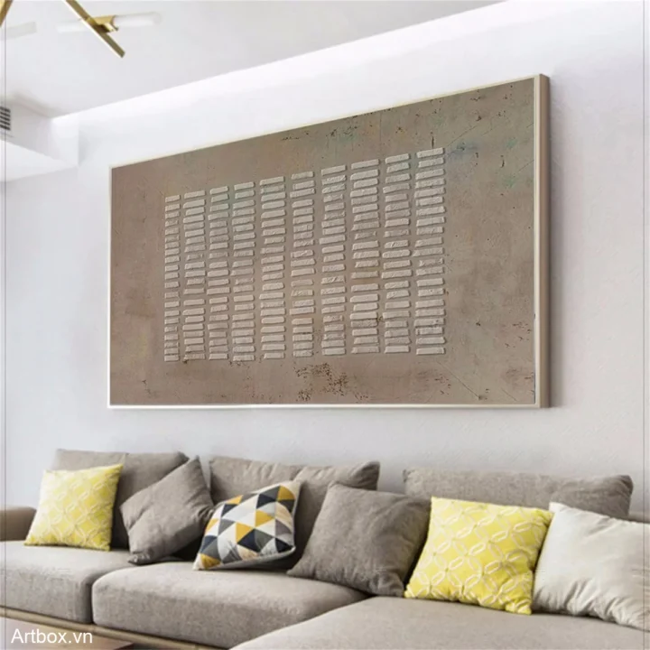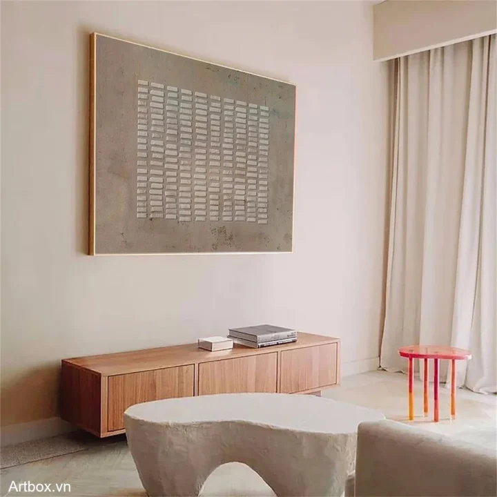 Bức tranh mang đến một cảm giác yên bình với các hình khối trừu tượng được sắp xếp một cách hài hòa. Những đường nét mềm mại và màu xám chủ đạo tạo nên một không gian tĩnh lặng, như một bản nhạc nhẹ nhàng đang vang lên. Các lớp sơn nổi khối tạo chiều sâu, khiến người xem cảm nhận được sự sống động và sự tương tác giữa ánh sáng và bóng tối. Tác phẩm này không chỉ là một phần trang trí mà còn là một tác phẩm nghệ thuật khơi gợi cảm xúc, mời gọi người xem dừng lại và thưởng thức vẻ đẹp giản dị nhưng sâu sắc của nó.