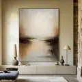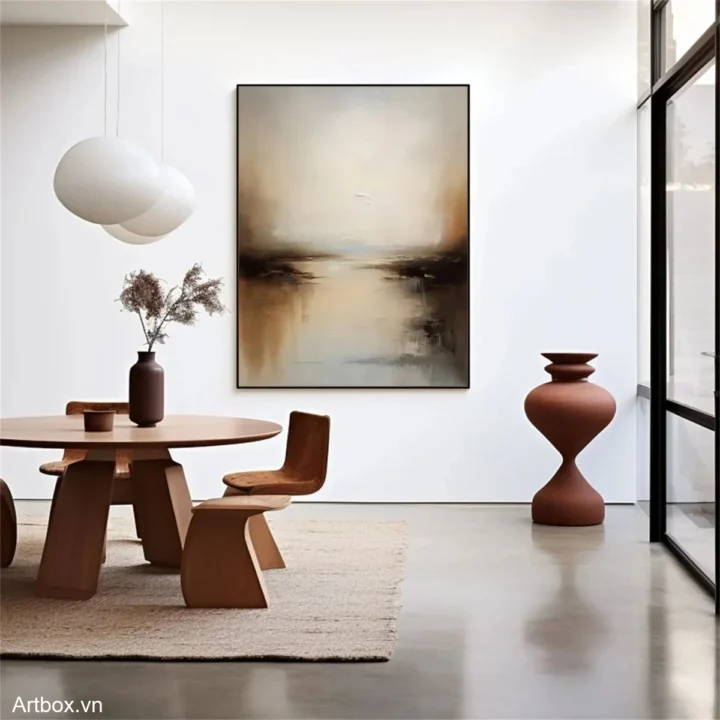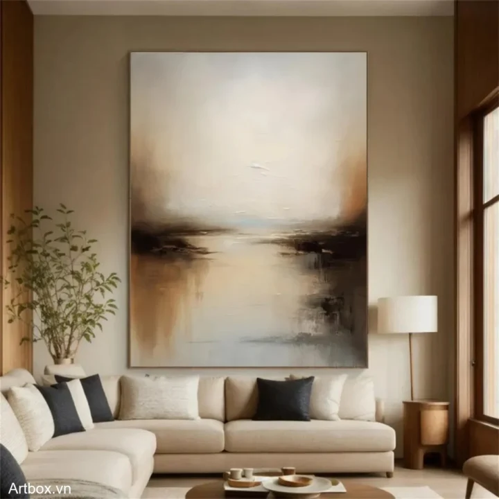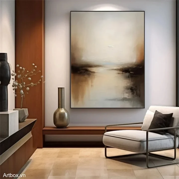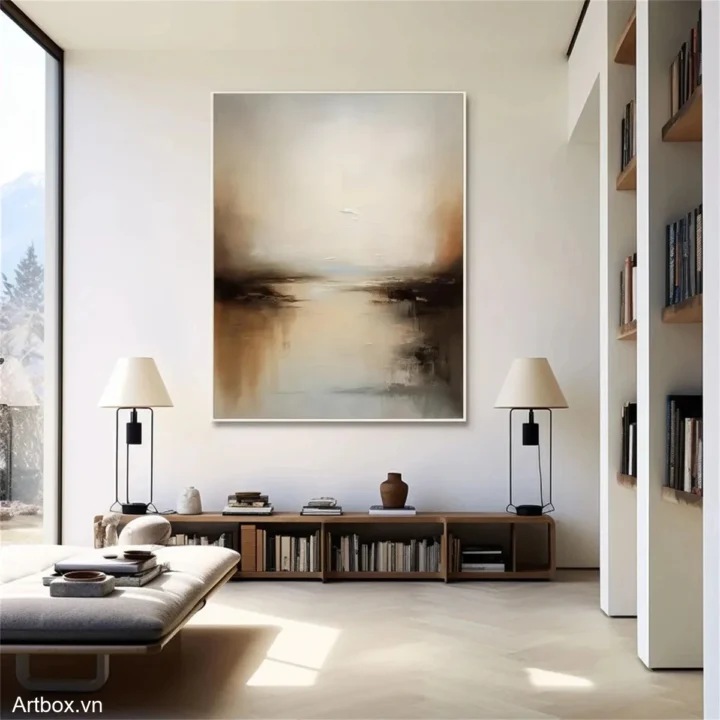 Bức tranh mang đến một khung cảnh yên bình, nơi ánh sáng nhẹ nhàng hòa quyện với những sắc thái nâu be ấm áp. Những nét vẽ mềm mại tạo nên hiệu ứng chiều sâu, như một bức tranh phản chiếu của thiên nhiên. Cảm giác tĩnh lặng và thư thái lan tỏa từ bức tranh, khiến người xem như lạc vào một không gian yên bình, tách biệt khỏi sự ồn ào của cuộc sống thường nhật. Sự kết hợp giữa các màu sắc nhẹ nhàng và kỹ thuật texture nổi tạo nên một tác phẩm nghệ thuật đầy cảm xúc và ý nghĩa.