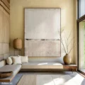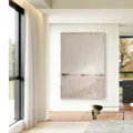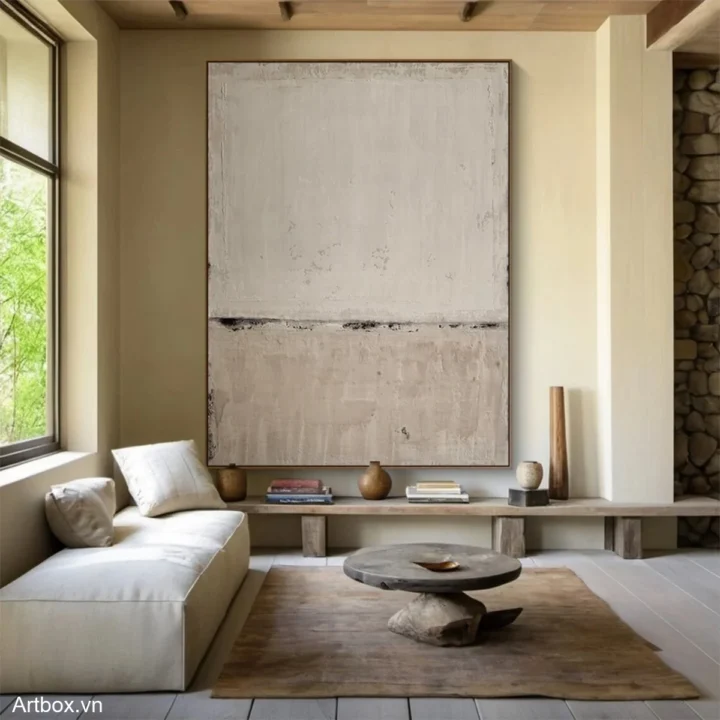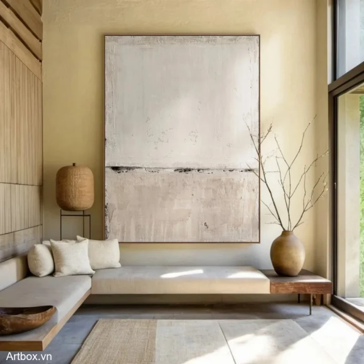 Bức tranh mang đến một không gian tĩnh lặng và thanh bình với những gam màu xám nhẹ nhàng, tạo cảm giác gần gũi và ấm áp. Các đường nét mềm mại và sự chuyển giao màu sắc tinh tế giữa các tông xám nhạt và nâu be làm nổi bật vẻ đẹp của sự giản dị. Kỹ thuật vẽ phẳng giúp cho bức tranh trở nên hiện đại, đồng thời cũng gợi nhớ đến vẻ đẹp tự nhiên của Wabi-Sabi. Từng chi tiết trong tranh như hòa quyện vào nhau, tạo nên một tác phẩm nghệ thuật không chỉ để ngắm nhìn mà còn để cảm nhận, mang lại sự thư giãn cho tâm hồn.