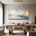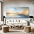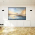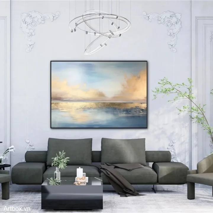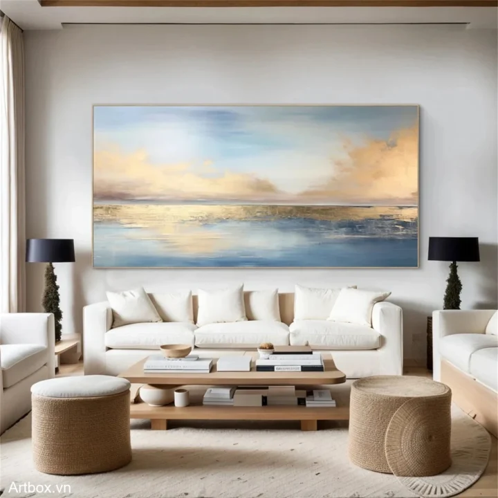 Bức tranh mang đến một khung cảnh thiên nhiên tuyệt đẹp, nơi ánh sáng và màu sắc hòa quyện một cách tinh tế. Bầu trời xanh dương nhẹ nhàng trải dài, điểm xuyết bởi những đám mây vàng cam mềm mại, phản chiếu xuống mặt nước phẳng lặng. Sự kết hợp giữa màu sắc và ánh sáng tạo nên cảm giác bình yên, thư thái, như một khoảnh khắc tĩnh lặng giữa dòng đời hối hả. Những gam màu nhẹ nhàng và sự chuyển tiếp mềm mại của chúng khiến người xem cảm nhận được sự hòa hợp của thiên nhiên, khơi gợi cảm xúc và sự thư giãn trong tâm hồn.