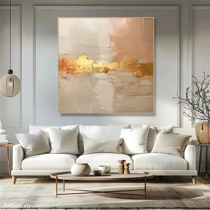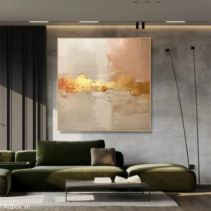 Bức tranh mang đến một cảm giác nhẹ nhàng và thư thái với sự hòa quyện của các tông màu ấm áp như vàng, cam và nâu. Các lớp sơn dày được áp dụng một cách khéo léo, tạo ra chiều sâu và texture nổi bật, khiến bức tranh trở nên sống động. Hình khối trừu tượng kết hợp với ánh sáng mềm mại tạo nên một không gian nghệ thuật đầy cảm xúc. Đây là một tác phẩm lý tưởng cho những ai yêu thích sự giản dị nhưng vẫn muốn mang lại sự tinh tế và hiện đại cho không gian sống.