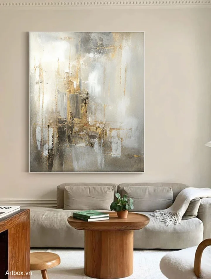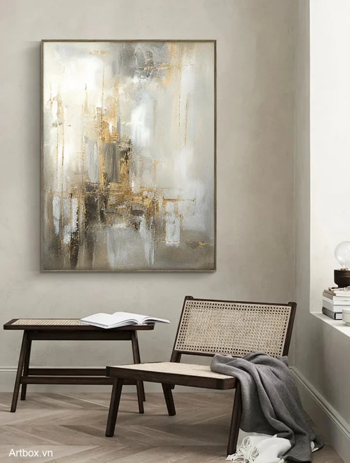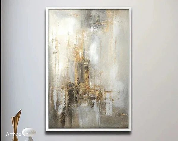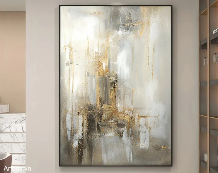 Bức tranh thể hiện sự hòa quyện giữa ánh sáng và bóng tối, với những sắc thái màu sắc đa dạng. Các nét vẽ mềm mại tạo nên một không gian trừu tượng đầy sức sống, mang lại cảm giác nhẹ nhàng và thanh thoát. Những mảng màu vàng ánh kim lấp lánh như ánh nắng, hòa quyện cùng các tông màu xám và trắng, tạo nên một bức tranh vừa hiện đại vừa tinh tế. Tác phẩm này không chỉ là nghệ thuật mà còn là một điểm nhấn ấn tượng cho không gian sống, khơi gợi cảm xúc và sự sáng tạo.