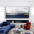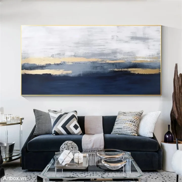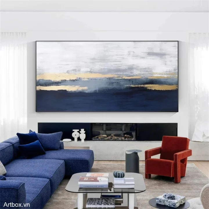 Bức tranh mang đến một cảm giác yên bình với những gam màu xanh dương và trắng hòa quyện nhẹ nhàng. Những nét vẽ mịn màng, không có texture, tạo ra một không gian thanh thoát, như làn sóng của bầu trời và biển cả. Sự chuyển tiếp giữa các sắc thái màu sắc tạo nên chiều sâu và sự huyền bí, khiến người xem dễ dàng lạc vào những cảm xúc dịu dàng và thư thái. Phong cách hiện đại và tối giản của tác phẩm giúp nó trở thành một điểm nhấn hoàn hảo cho không gian sống, mang lại sự tươi mới và năng lượng tích cực cho người chiêm ngưỡng.
