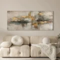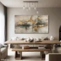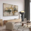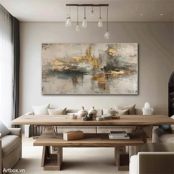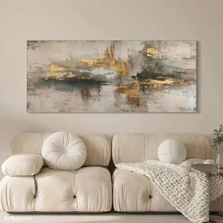 Bức tranh mang đến một không gian trừu tượng với sự hòa quyện của các sắc thái màu sắc nhẹ nhàng và ấm áp. Những nét vẽ dày, tạo texture nổi, mang lại chiều sâu và cảm giác sống động cho tác phẩm. Sự kết hợp giữa màu vàng ấm và các tông màu trung tính tạo ra một cảm giác gần gũi, ấm cúng, nhưng vẫn đầy tính nghệ thuật. Bức tranh không chỉ là một tác phẩm nghệ thuật mà còn là một điểm nhấn tinh tế trong không gian sống, mang lại sự thư giãn và cảm hứng cho người xem.