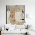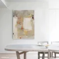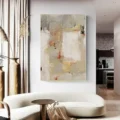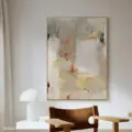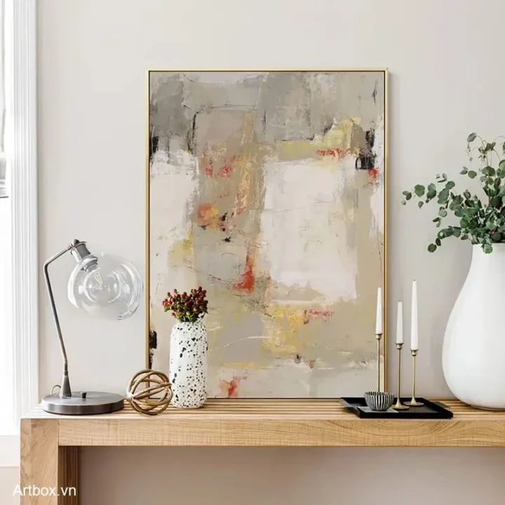 Bức tranh mang đến một không gian nghệ thuật trừu tượng với sự kết hợp hài hòa của các tông màu sáng và nhẹ nhàng. Những mảng màu vàng nhạt, xám và trắng giao thoa với những nét chấm phá đỏ và đen, tạo nên sự chuyển động và chiều sâu cho tác phẩm. Kỹ thuật vẽ phẳng giúp hình ảnh trở nên tinh tế, nhẹ nhàng, nhưng vẫn đầy sức sống. Cảm xúc dịu nhẹ và sáng sủa lan tỏa từ bức tranh, khiến người xem cảm thấy thư giãn và an yên. Đây là một tác phẩm hoàn hảo cho không gian phòng khách, mang lại sự hiện đại và nghệ thuật cho ngôi nhà.