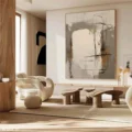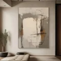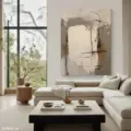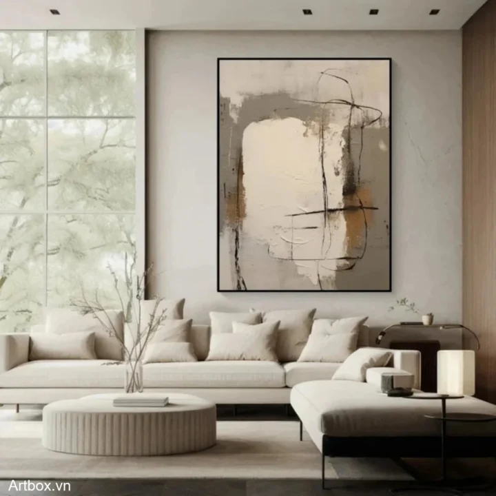 Bức tranh mang đến một cảm giác trừu tượng đầy mê hoặc với sự hòa quyện của các tông màu nâu be và trắng tinh khiết. Những đường nét mềm mại và hình khối không rõ ràng tạo nên một không gian nghệ thuật đầy cảm xúc. Kỹ thuật texture nổi được sử dụng khéo léo, mang lại chiều sâu và sự sống động cho bức tranh, khiến người xem có thể cảm nhận được sự ấm áp và dịu nhẹ. Đây là một tác phẩm lý tưởng cho những không gian hiện đại, nơi mà sự tối giản và tinh tế được đề cao.